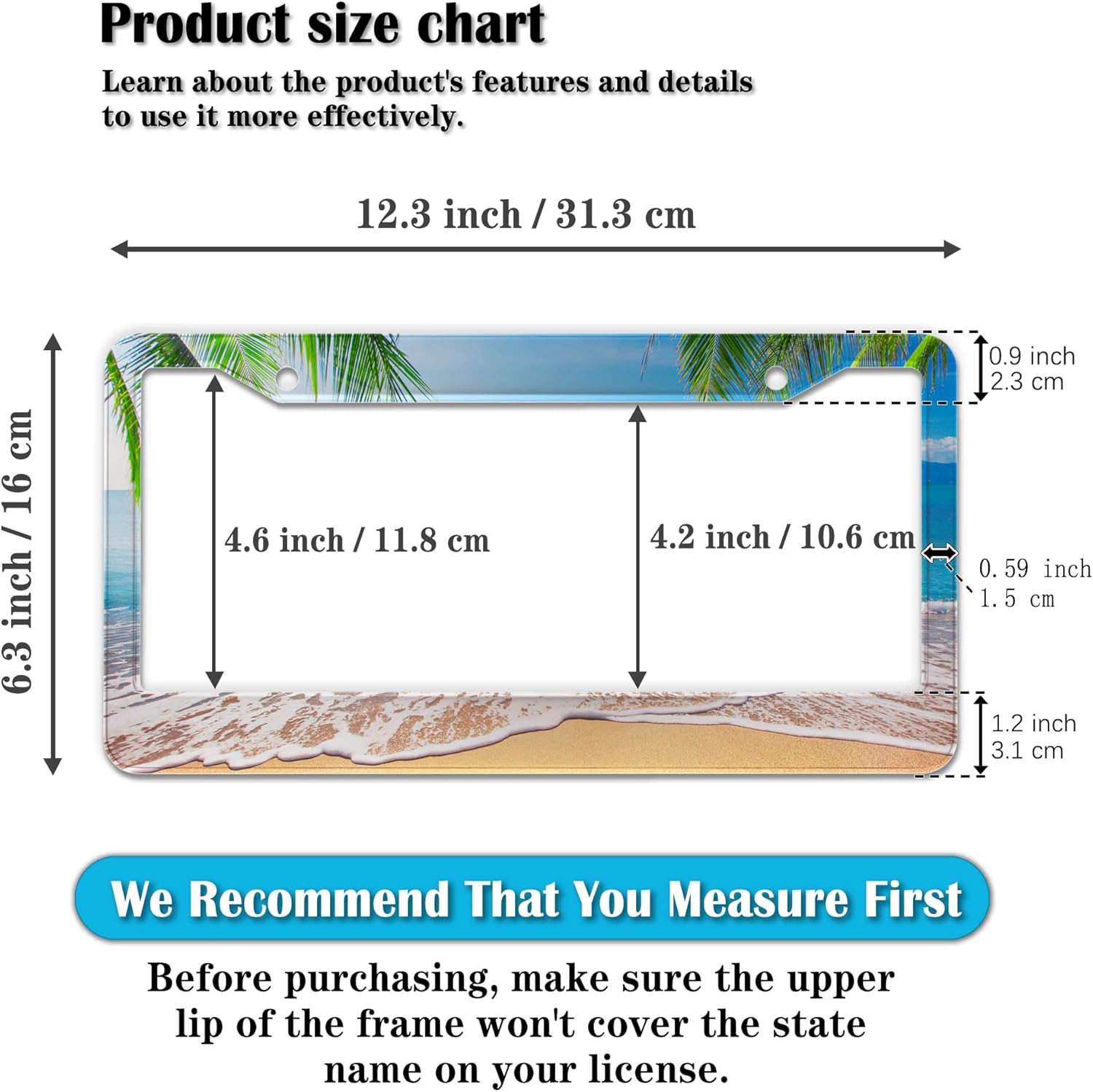 - STANDARD FRAME SIZE: Ensure a perfect fit by checking the dimensions to avoid covering your state name. These frames are specifically designed to fit standard American license plates measuring approximately 12.3" x 6.3" (16 x 31 cm). for most license plates in the U.S.