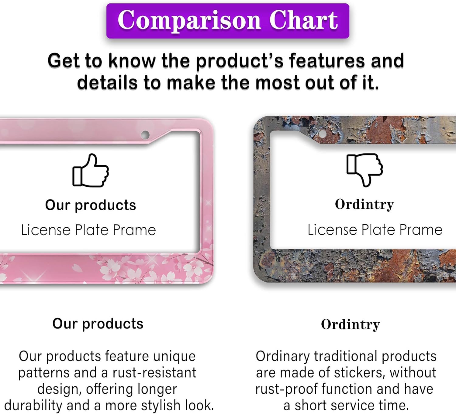 - ALUMINUM FRAME: This License Plate Frame is crafted from high-quality aluminum that is resistant to corrosion, rust, and harsh weather conditions. Its rugged reliability design ensures a long lifespan, making it capable of withstanding car washes and extreme weather, providing you with a reliable and stylish solution for your vehicle.