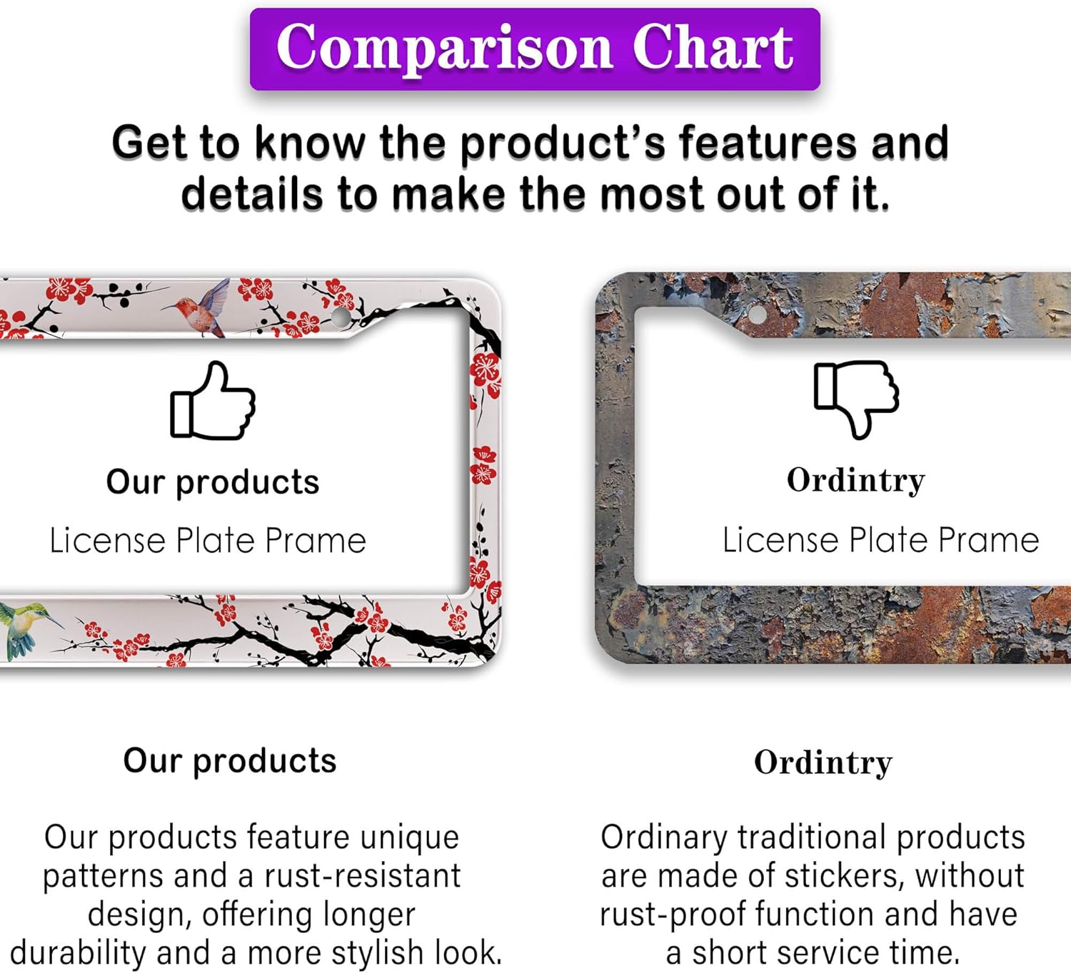- ALUMINUM FRAME: This License Plate Frame is crafted from high-quality aluminum that is resistant to corrosion, rust, and harsh weather conditions. Its rugged reliability design ensures a long lifespan, making it capable of withstanding car washes and extreme weather, providing you with a reliable and stylish solution for your vehicle.