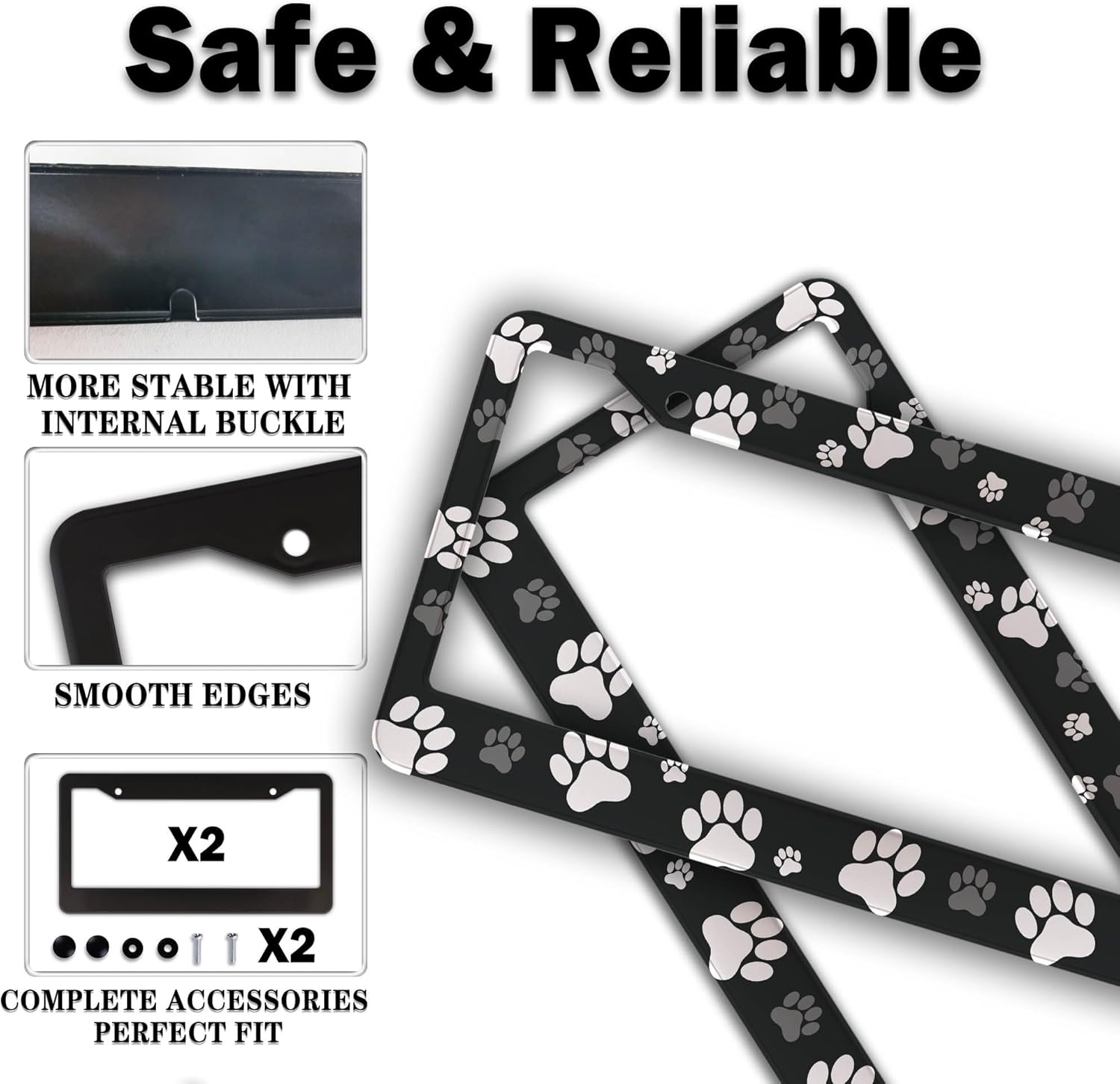 License Plate Covers Black and White License Plate Frames Paw Print Dog Cat Universal Aluminum Car Accessory 2 Pack with Screw Covers Set