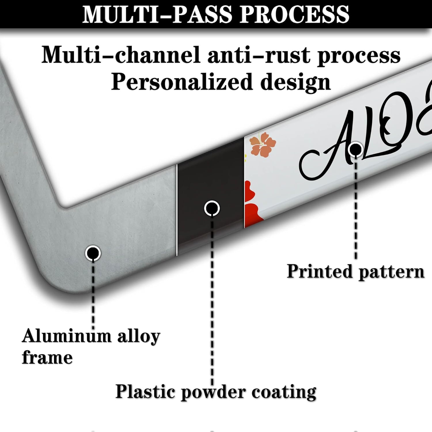 - ALUMINUM FRAME: This License Plate Frame is crafted from high-quality aluminum that is resistant to corrosion, rust, and harsh weather conditions. Its rugged reliability design ensures a long lifespan, making it capable of withstanding car washes and extreme weather, providing you with a reliable and stylish solution for your vehicle.