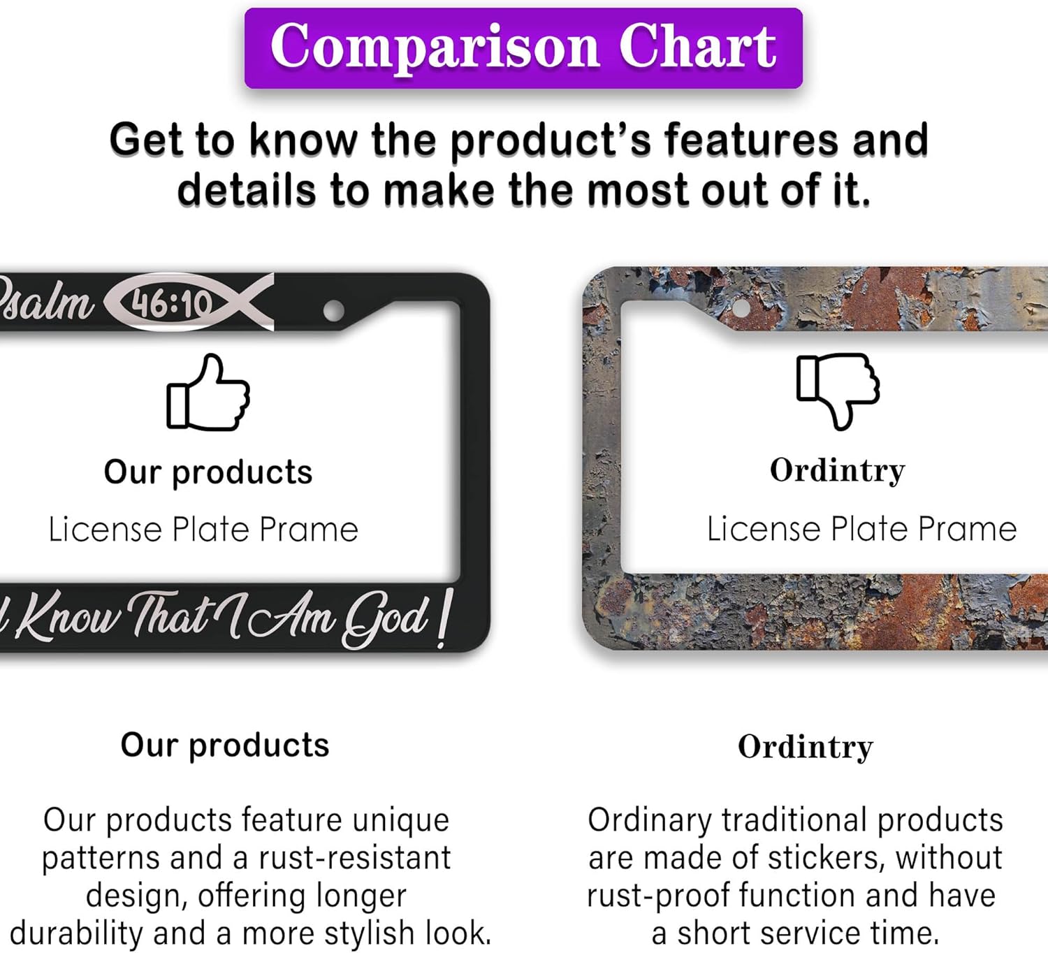 - ALUMINUM FRAME: This License Plate Frame is crafted from high-quality aluminum that is resistant to corrosion, rust, and harsh weather conditions. Its rugged reliability design ensures a long lifespan, making it capable of withstanding car washes and extreme weather, providing you with a reliable and stylish solution for your vehicle.