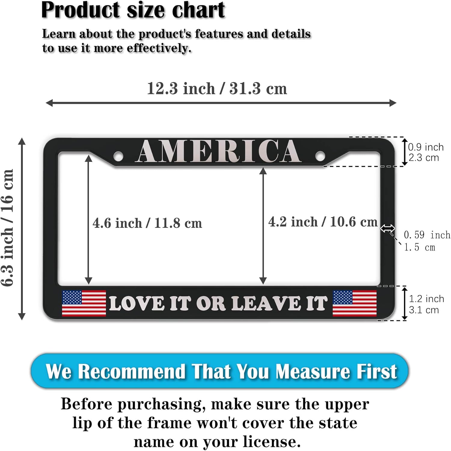 - STANDARD FRAME SIZE: Ensure a perfect fit by checking the dimensions to avoid covering your state name. These frames are specifically designed to fit standard American license plates measuring approximately 12.3" x 6.3" (16 x 31 cm). for most license plates in the U.S.