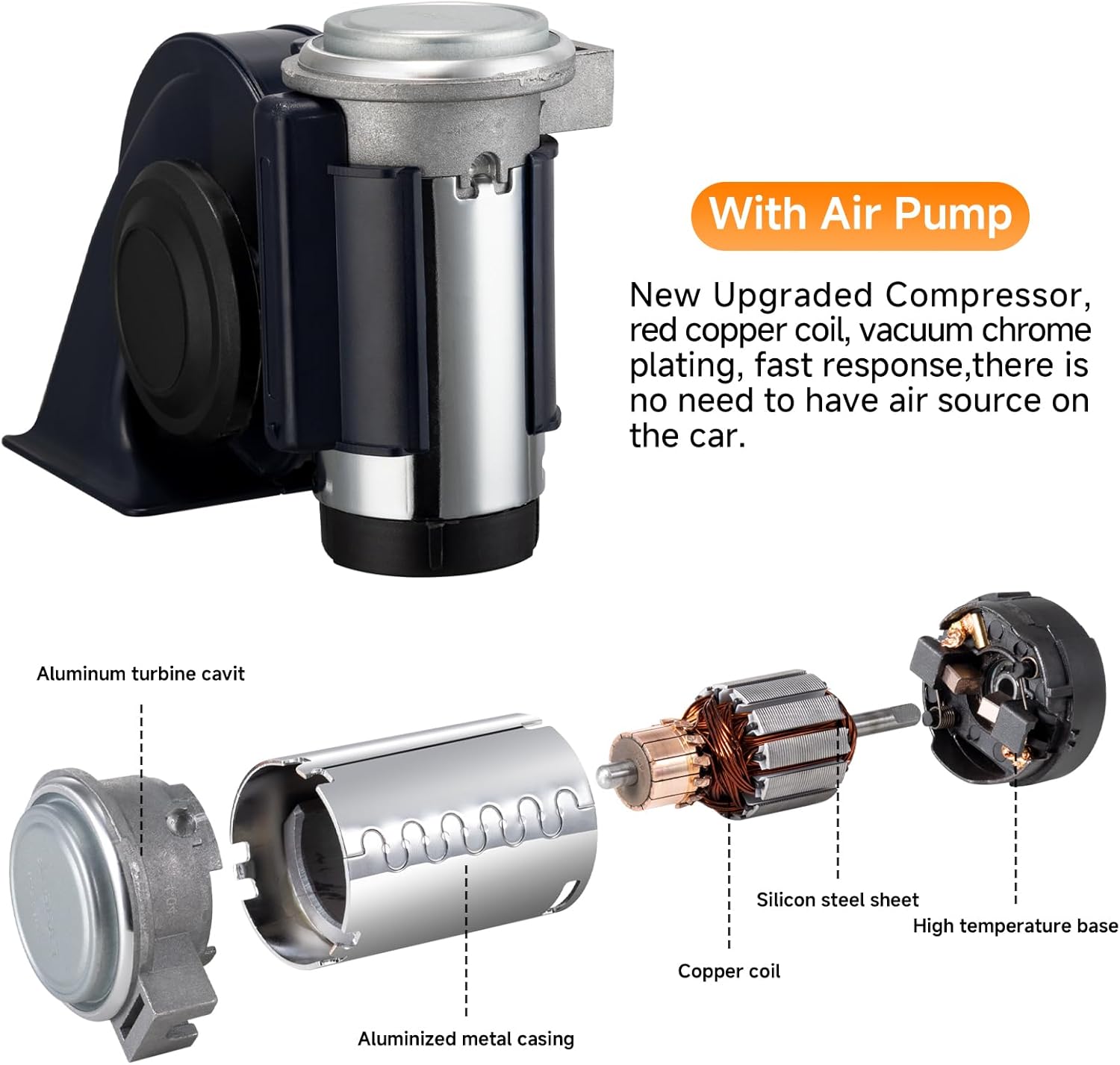 - ăInnovative DesignăOur air horn features an extremely powerful directly injected mini-compressor paired with a snail design, up to 150DB ! The sound is harmonious, loud enough, and the sound quality is excellent. All integrated into one small but powerful device