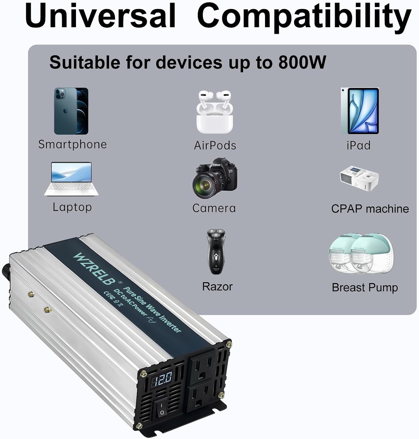 WZRELB 800W Pure Sine Wave Inverter 12V DC to 110V 120V AC Power Converter with LED Display, Off-Grid Portable Power Inverter with 2 AC Outlets for Home, RV, Truck, Camping