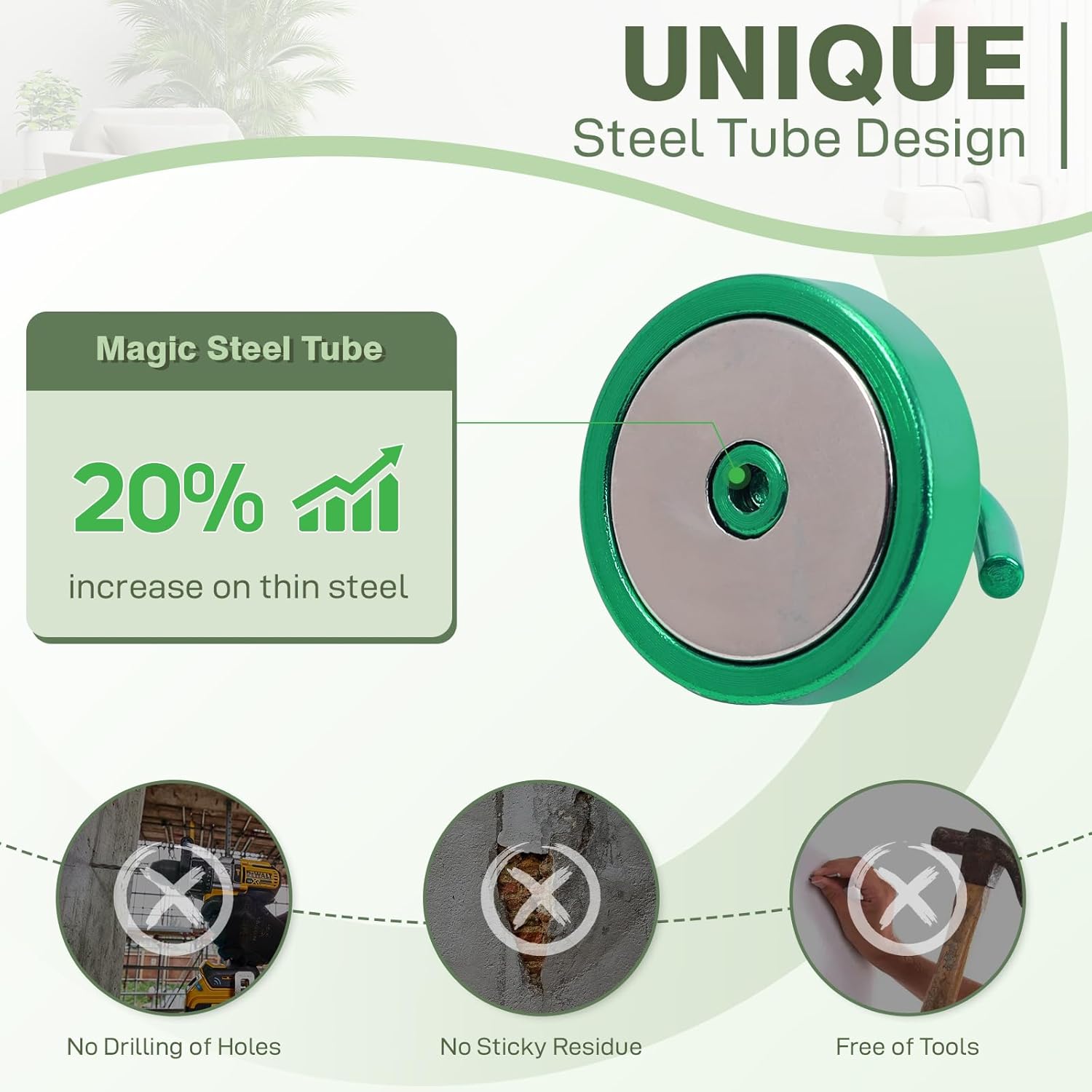 - ✔MAGIC STEEL TUBE DESIGN - Unique design of steel tube inside the base of magnetic hooks greatly increases the attractive force , especially on thin steel! It increase approximately 20% force comparing those none-tube magnets. it solves the problem of weak force on thin steel. Permanent magnetic hook with magic steel tube, strong magnetism lasts forever!