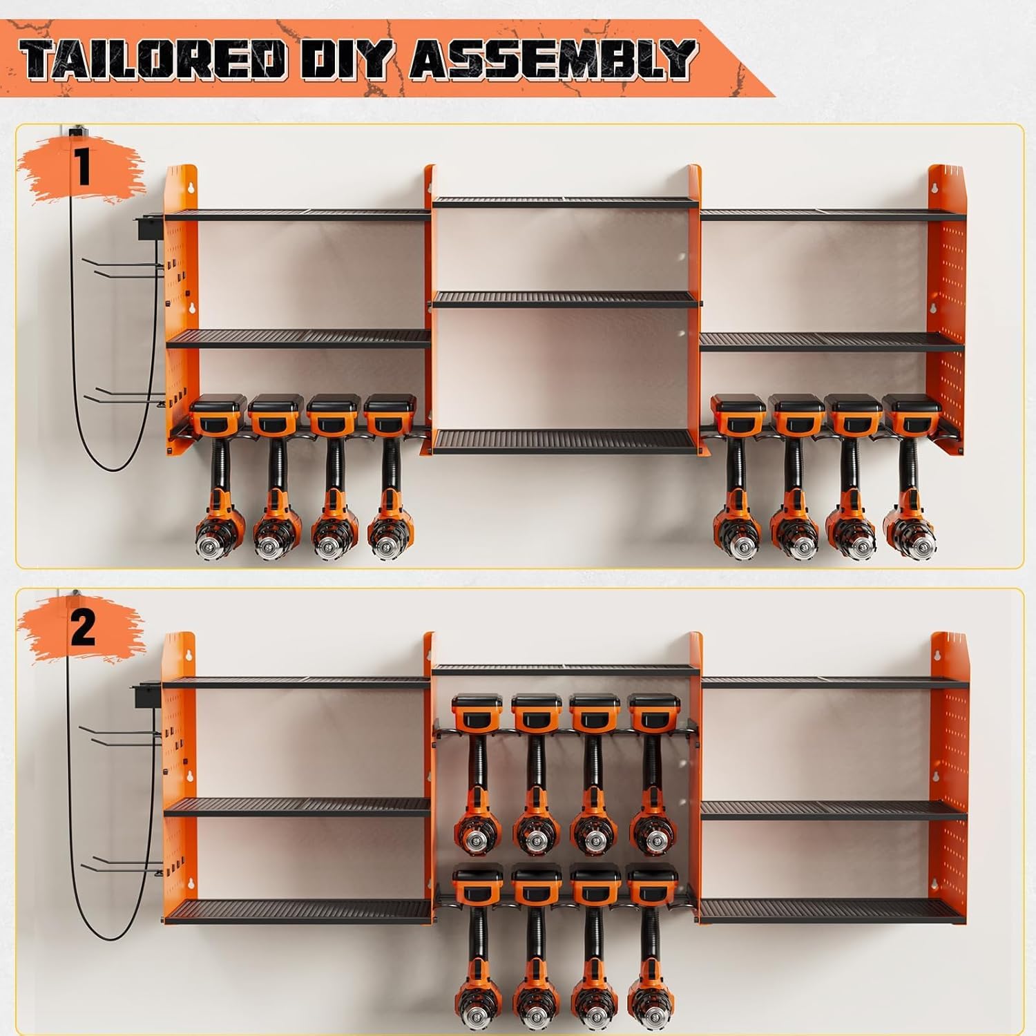 Power Tool Organizer with Charging Station Wall Mount, 3 Layer Expanded Heavy Duty Garage Organization, 45.5 Inch Length Garage Tool Storage, 8 Drills, 2 Assemble Method, Orange