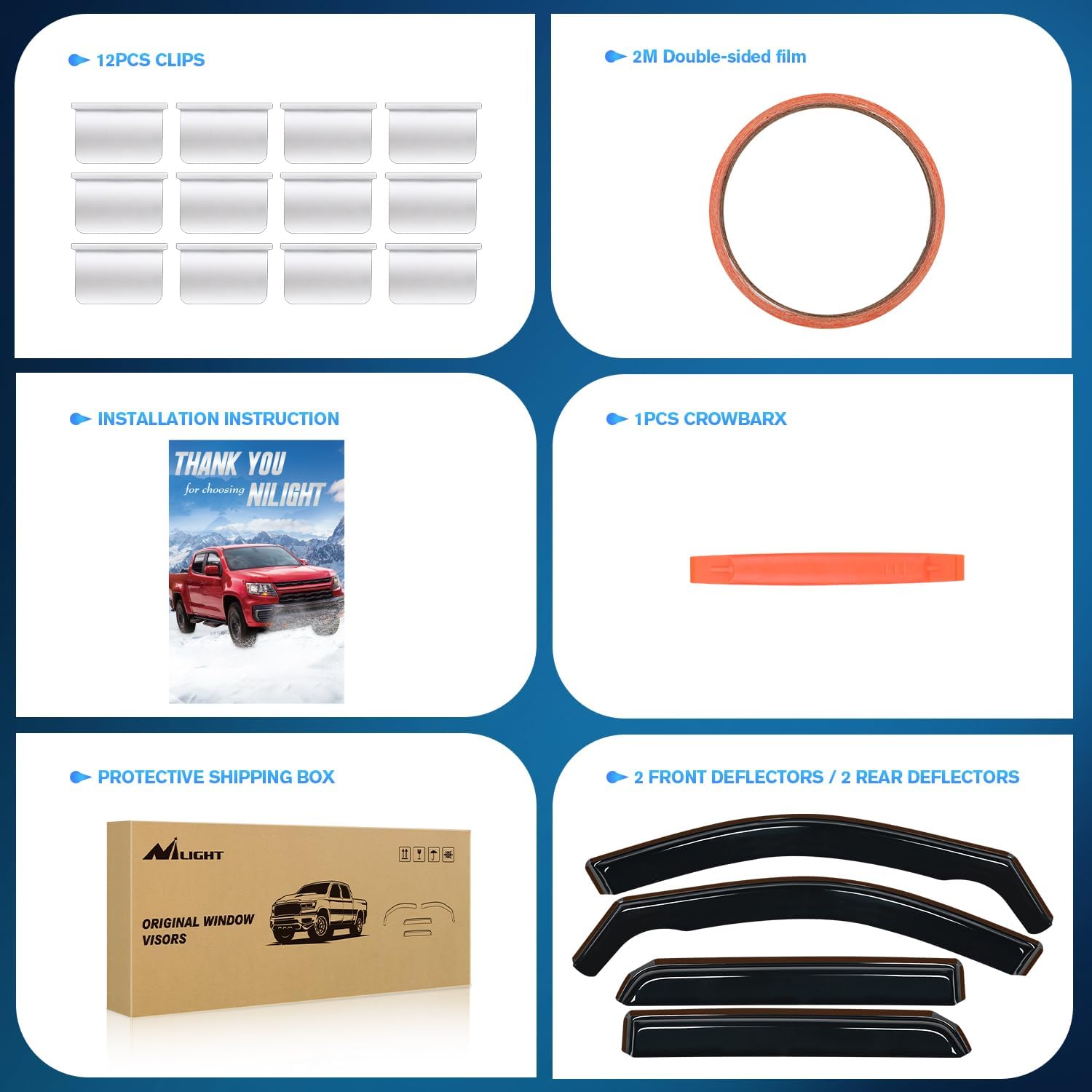 - PERFECT FIT:Window Deflectors made with tough and shatterproof premium-quality acrylic, will not easy bend, break or crack.Designed with precise engineering data to ensure custom fit to your vehicle.Reduce interior wind noise and reduce glare during night driving.