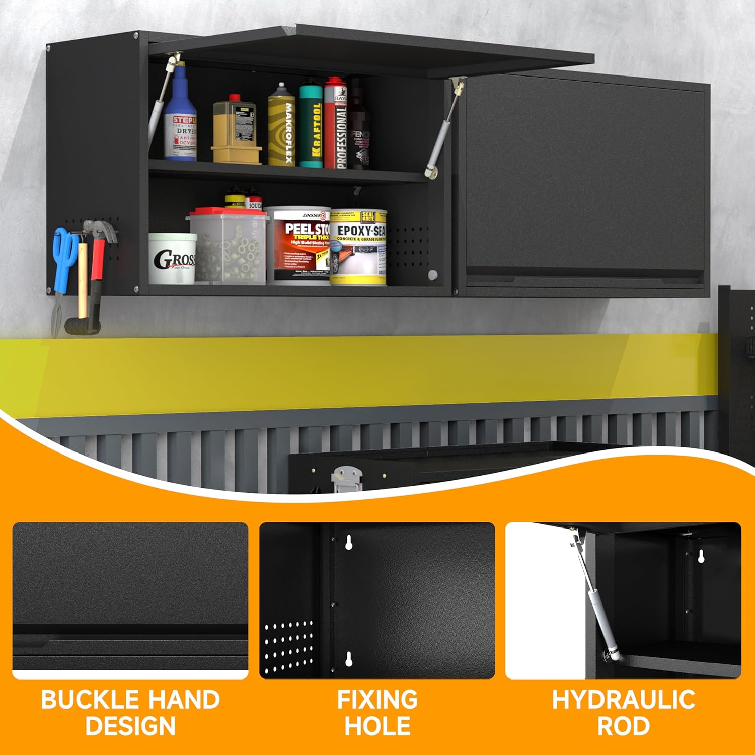 - đăHYDRAULIC-OPENING DOORăThe door of the floating garage tool cabinet has a hydraulic lever with an upward opening design that opens and closes at an angle of 90 degrees, the hydraulic-rod to keep the door up so that free your hands while you put in or take out items. Each corner features a mounting hole, allowing this wall storage cabinet to be firmly fixed to the wall without any risk of falling.