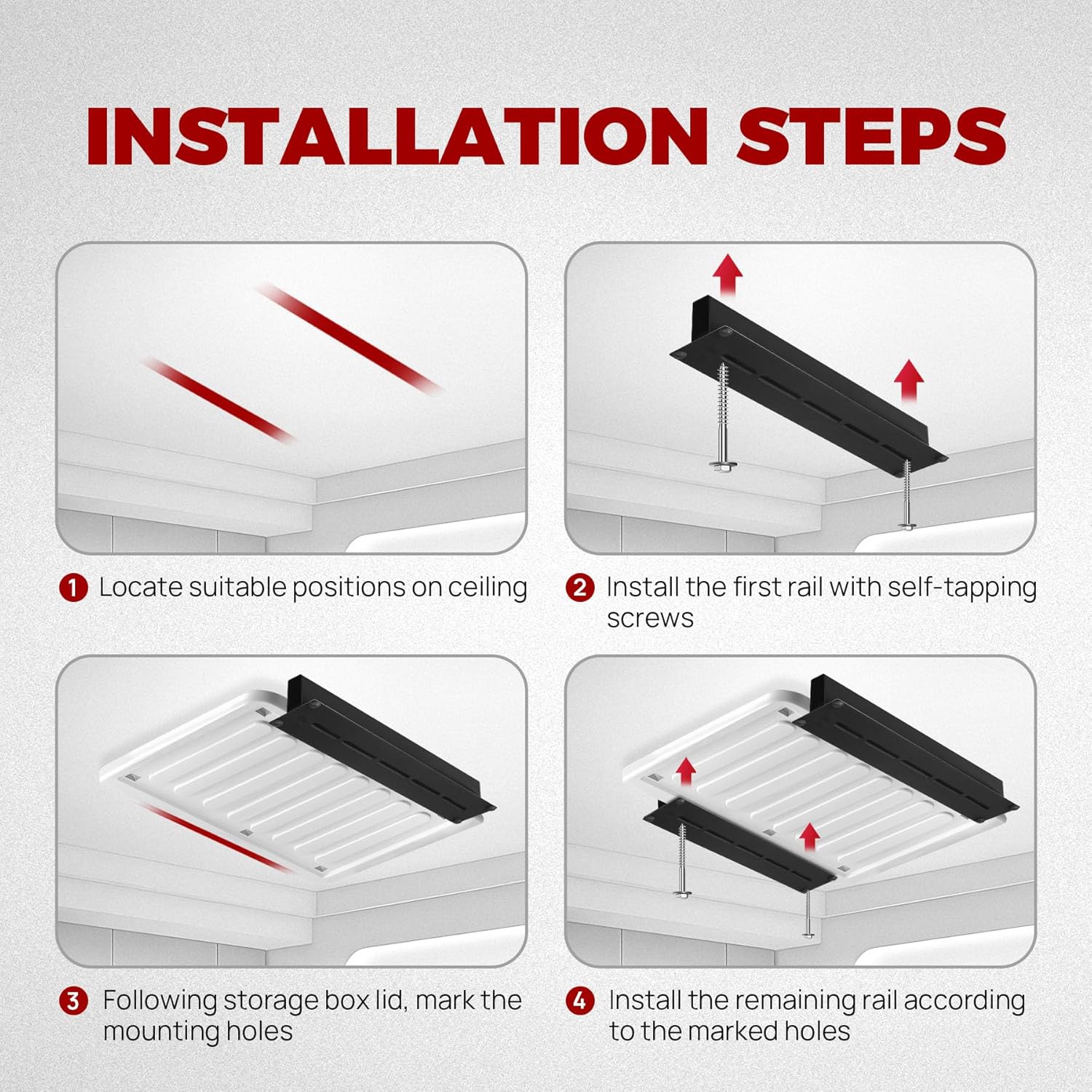 - [Widely Applicable] - Featuring a perfect size for compact storage and quick access, each 17-inch long rail of this garage ceiling storage rack can fit most of bins, Bins Not Included