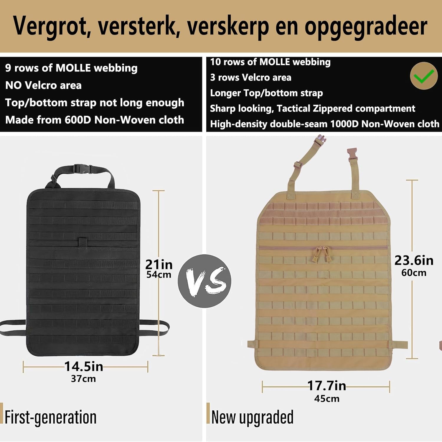 - 🚗 Multifunctional Storage - Design with 5 Molle bags on the back to help you store tactical gear & personal items and save space. Difference sizes of Molle bags help you classify your items so easily.you can set the Tactical Seat ​Back Organizer according to your own habits and need.