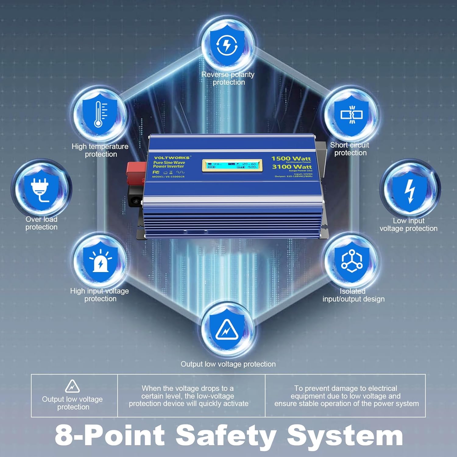 - 【Upgraded 8 Advanced Protections】1500 watt inverter pure sine wave including Reverse polarity protection, Input over-voltage/under-voltage protection, Output short-circuit protection, Over-load protection, Over-temperature protection, Low-input alarm. And 2025 upgraded Low-Output Voltage Protection also provide more stable voltage protection to your loads.