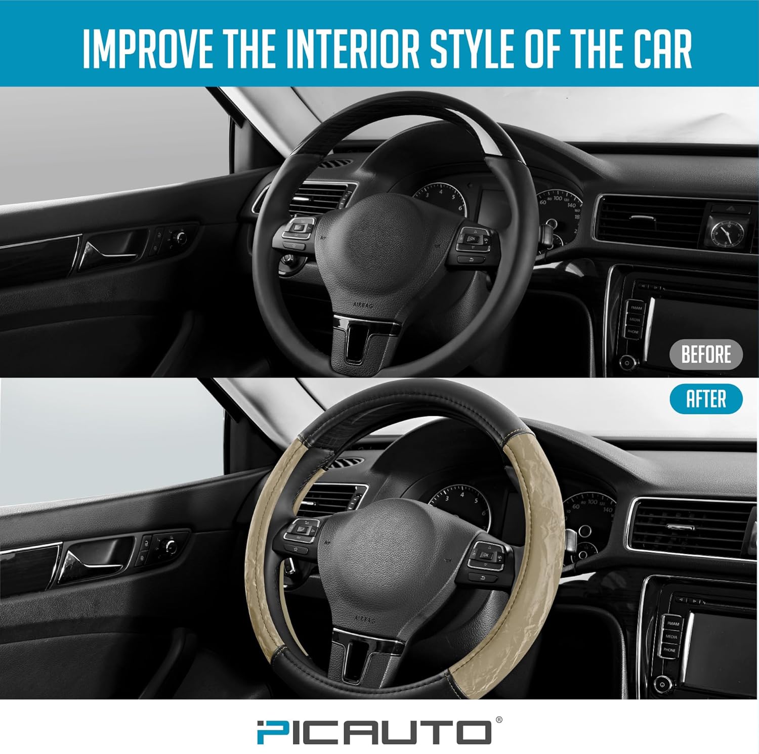 PIC AUTO Steering Wheel Cover, Silk Grain Leather Car Steering Wheel Protector, Comfortable Grip, Universal 14.5-15.5 Inch Anti-Slip Steering Wheels Accessories for Men & Women (Beige)