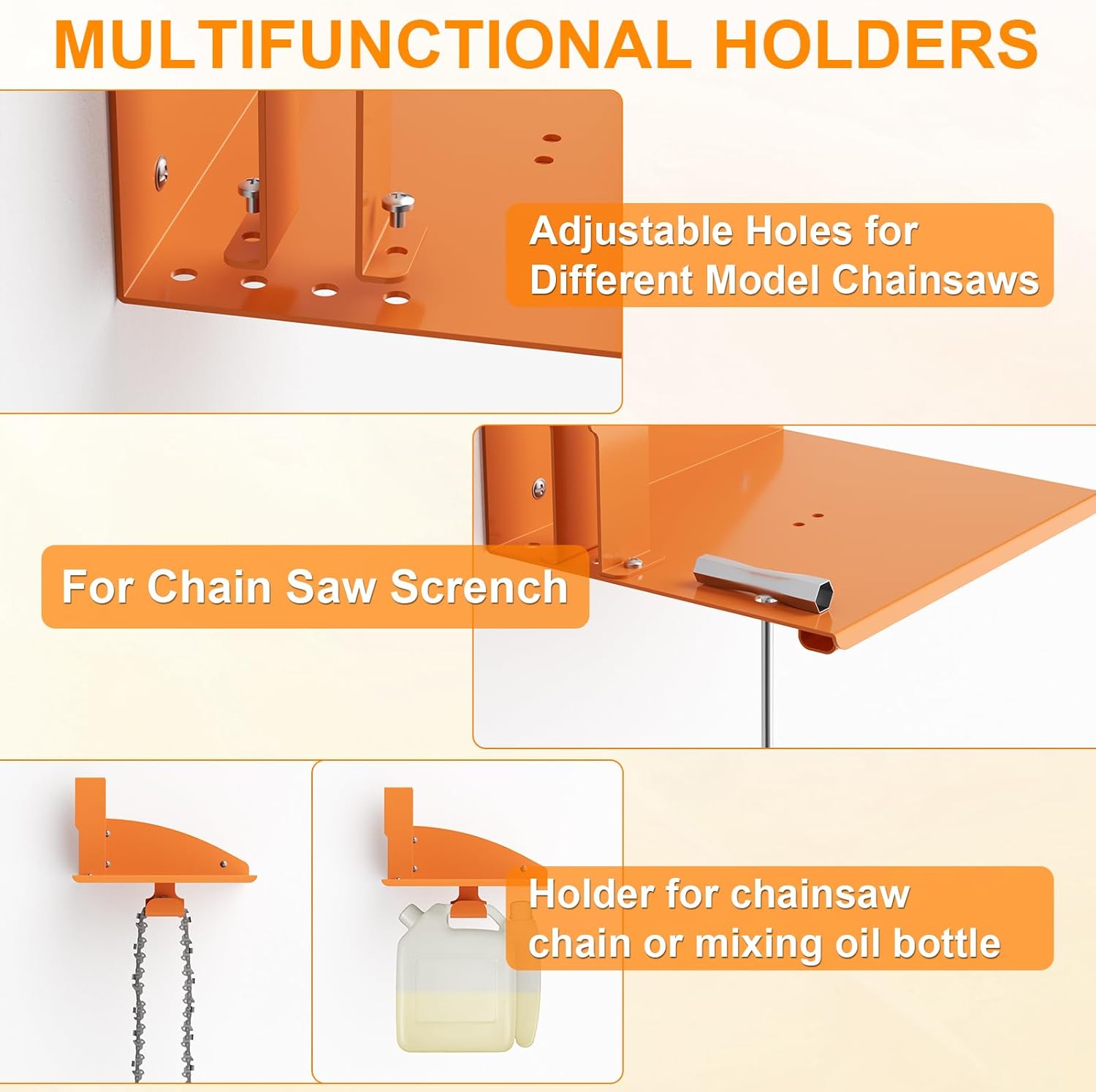 - Multi-Functional Storage: This rack includes a dedicated spot to store your chainsaw scrench, and an additional hook at the bottom to hang chainsaw chains or mixing oil bottles. Unlike other holders with limited storage capacity, our design offers more space and functionality
