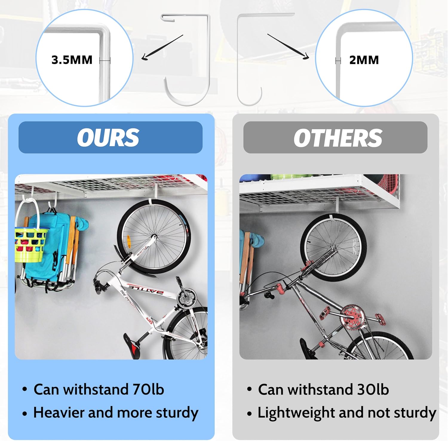 - Multipurpose Flat Hooks:these shelving hooks are suitable for hanging bicycles, getting the bikes up off of the garage floor offer you so much more room, also widely applied for hanging tools, sporting goods, lawn chairs, etc