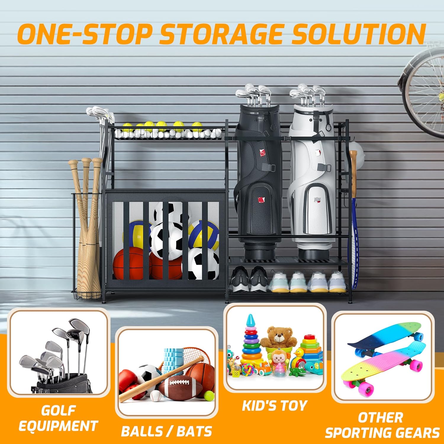- 【Generous Storage for Golf Bags】: The ball rack includes a dedicated area for storing 2 golf bags with secure buckle straps to keep your bags in place. It also features additional shelves for storing golf shoes and other golf accessories, freeing up valuable floor space in your garage.