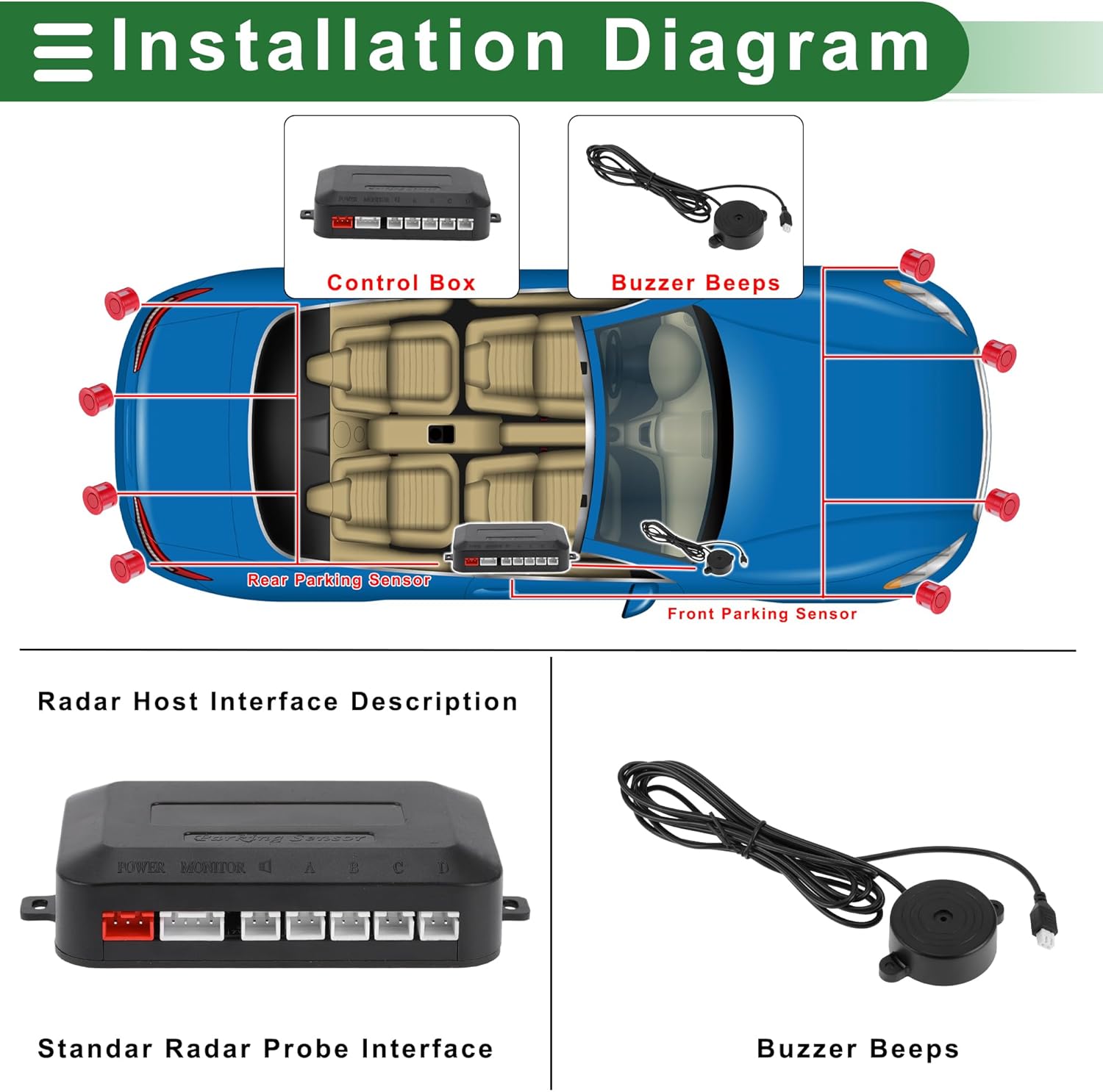 - What You Get:This parking sensor system includes 2 Parking Sensors, a Control box, and Buzzer Beeps.