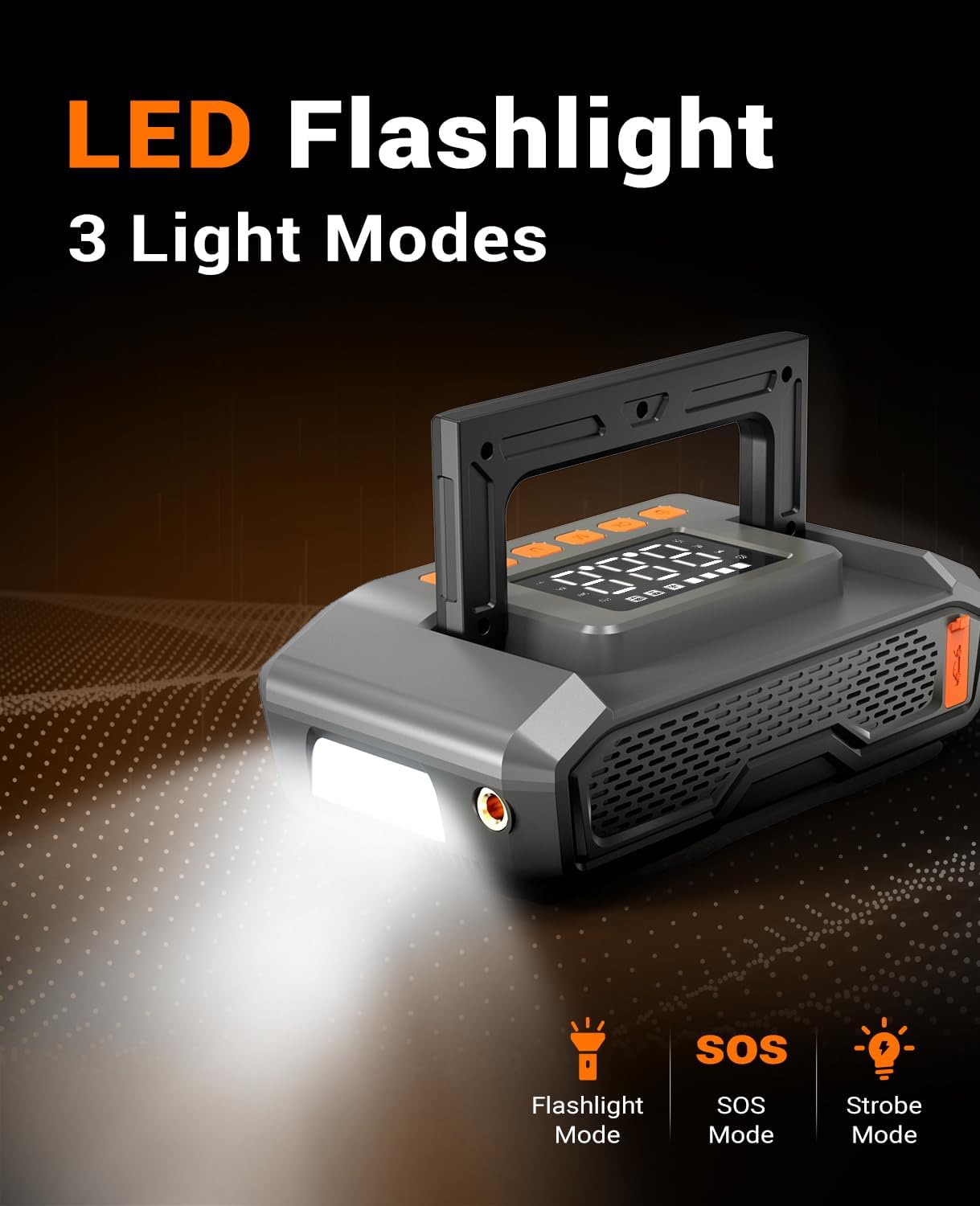 - PEACE OF MIND ON THE ROAD: This lightweight and portable jump box combines a jump starter, power bank, tire inflator, and a bright LED flashlight into one compact unit. Featuring dual Type-C ports for charging your mobile devices, it can fully inflate a tire in just ten minutes. The 400-lumen LED light offers three illumination modes: continuous (white), strobe, and SOS (red), ensuring you are prepared for any situation.