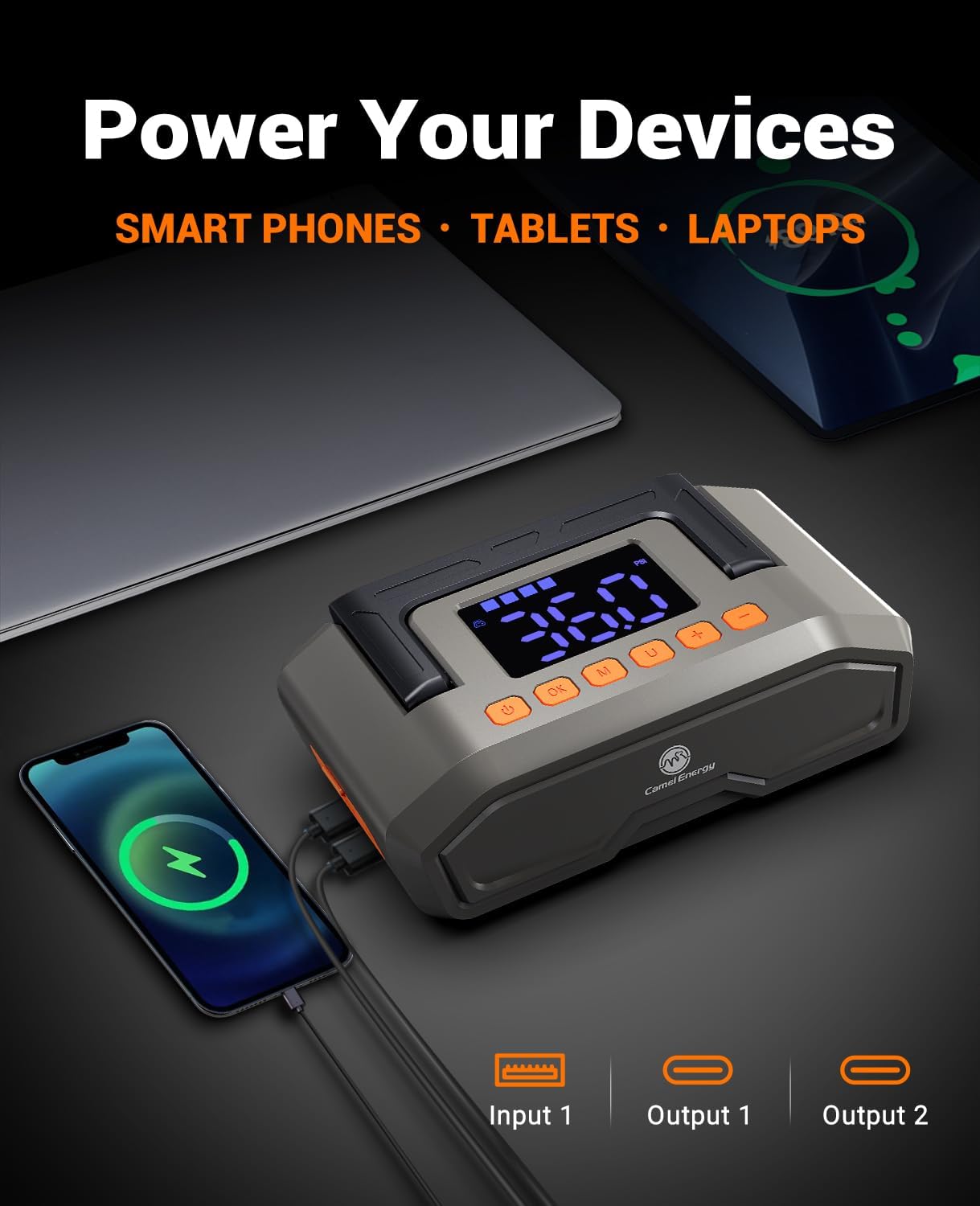 - WHAT YOU GET: Camel Energy jump pack (1* jump starter with air compressor, 1* upgraded jumper cables, 1* air pump hose, 3* gas nozzles, 1* USB-C charging cable, 1* user manual, 1* portable EVA carrying case, 1-YEAR Warranty and lifetime tech support. If you have any after-sales questions about jump starters, please contact us.