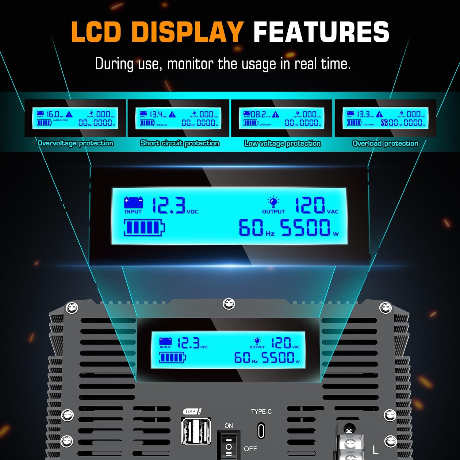 5500 Watt Power Inverter 12V DC to 110V 120V Converter for Family RV Off Grid Solar System Car with Type-C Ports 3 AC Power Outlets Dual USB Ports LCD Display Wireless Remote Control