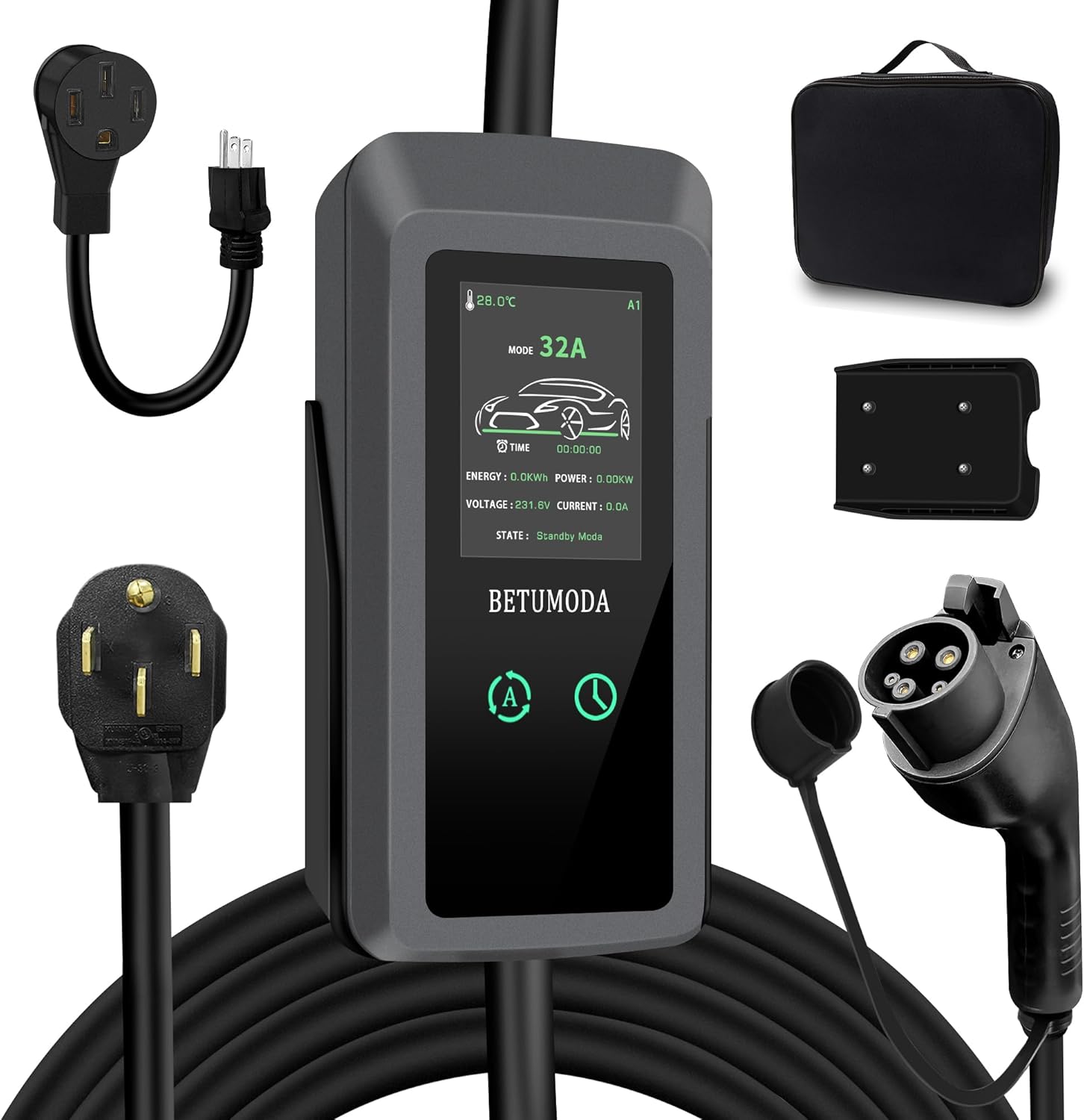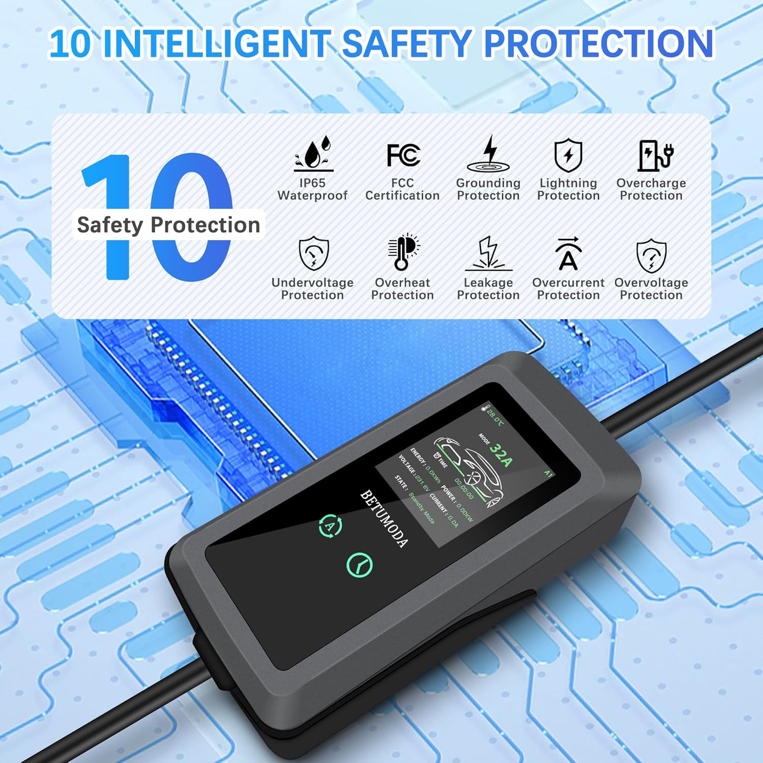 - Safety: Our charger has passed FCC certification and is equipped with built-in over-voltage, over-current, and short-circuit protection. In the event of an overload, the protection mechanism will automatically report errors and power off to ensure top-notch safety. Additionally, its IP65 waterproof design ensures durability and safety in various weather conditions.ïŒ Important Reminder: Please only use the original adapter included with this charger. Using third-party or incompatible adapters may lead to overload, short circuits, or damage to your vehicle or EV charger.)