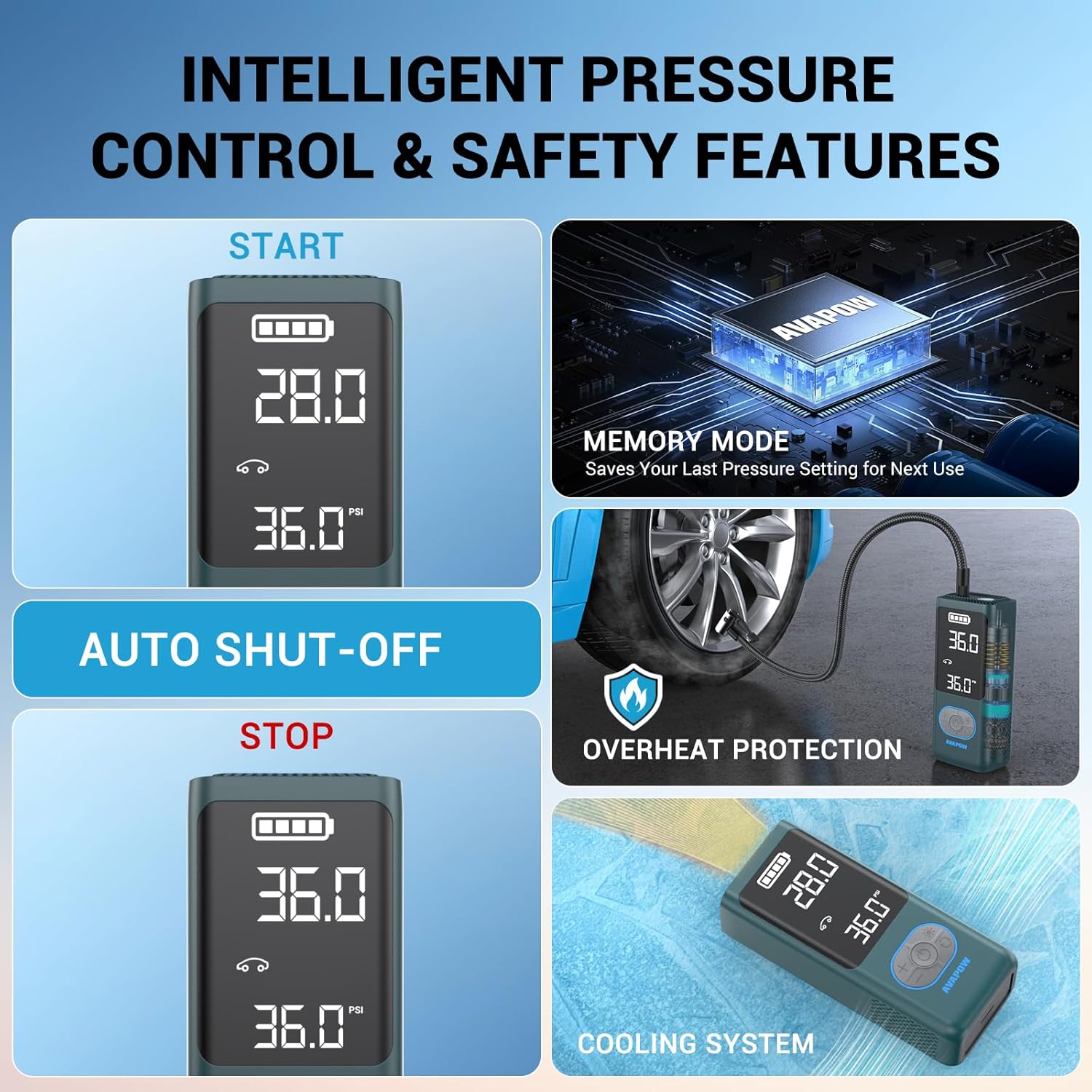 - Highest Rated Tire Inflator: Equipped with a memory pressure mode, the AVAPOW digital tire inflator remembers your preferred settings and automatically shuts off once the desired pressure is reached, preventing over-inflation. It is also equipped with overheat protection and a multi-port cooling system, ensuring safe and reliable operation during use.