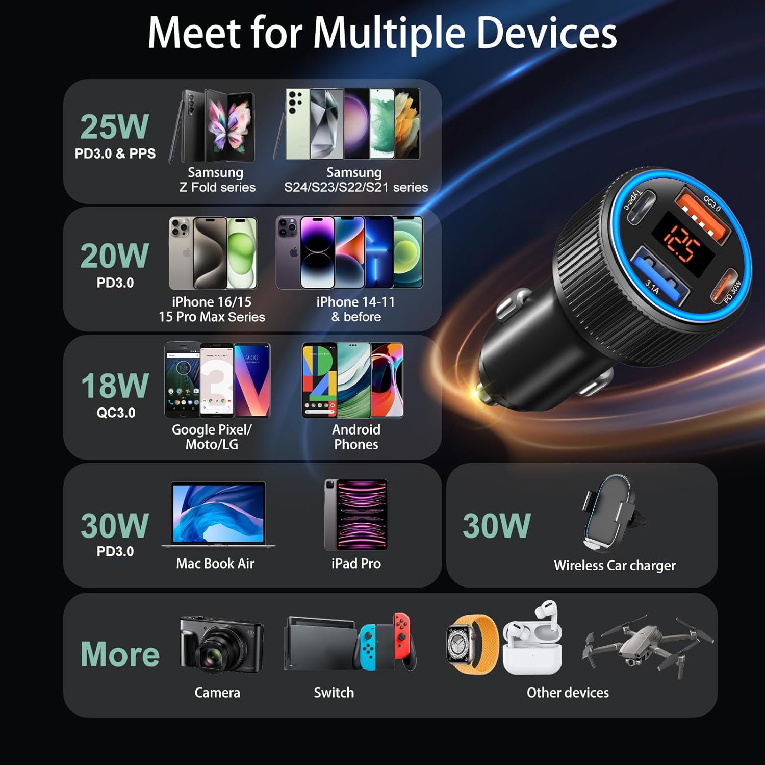 - [Upgraded 4-in-1 Car Phone Charger] Designed with dual 12V usb-c and usb-a car charging ports arranged on the edge of the car charger, you can easily plug all types of charging cords to power up your devices. It provide multiple charging protocol options and has connections for both standard usb and latest usb-c connectors.