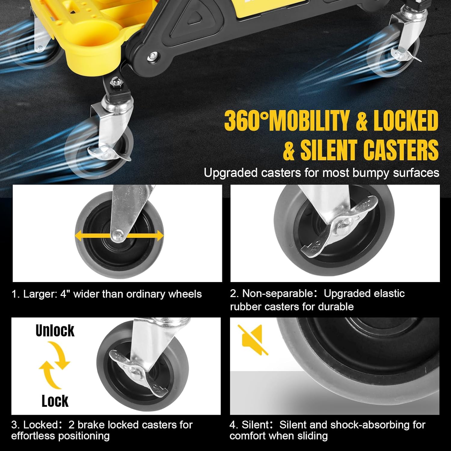 - Upgrade Wheels Smooth Sliding:The Mechanic Stool's wheels have been upgraded to compare to others. With four 4" elastic rubber wheels has silent shock absorber features that not only keep your work environment comfortable but also it won't damage your floors.360°swivel casters can be flexible sliding even on bumpy surfaces Garage seat has 2 lockable casters that can be effortless positioning to concentrate on repairs