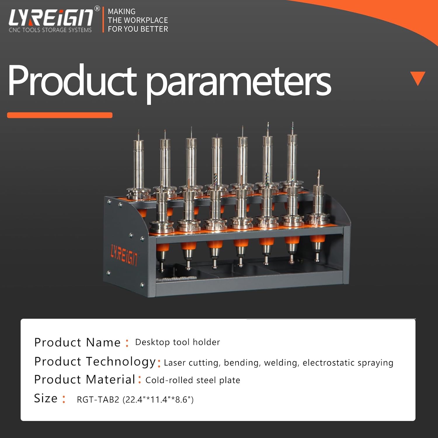 - CLASSIC DESIGN: LYREIGN CNC tool holder is specially designed for CNC machinists and workers. Our CNC tool rack is well-structured and provides ample space to storeand organize CAT 40 and 40 threaded tool holders. The 2-layer desktop design makesit convenient to place anywhere in your workshop. Tool compartment significantly improves the efficiency of workshops factories and manufacturing processes. Model: CAT/BT40-14CAP. Size: 22"L x 11.4"W x 8.6"H. Weight: 14.3LBS.