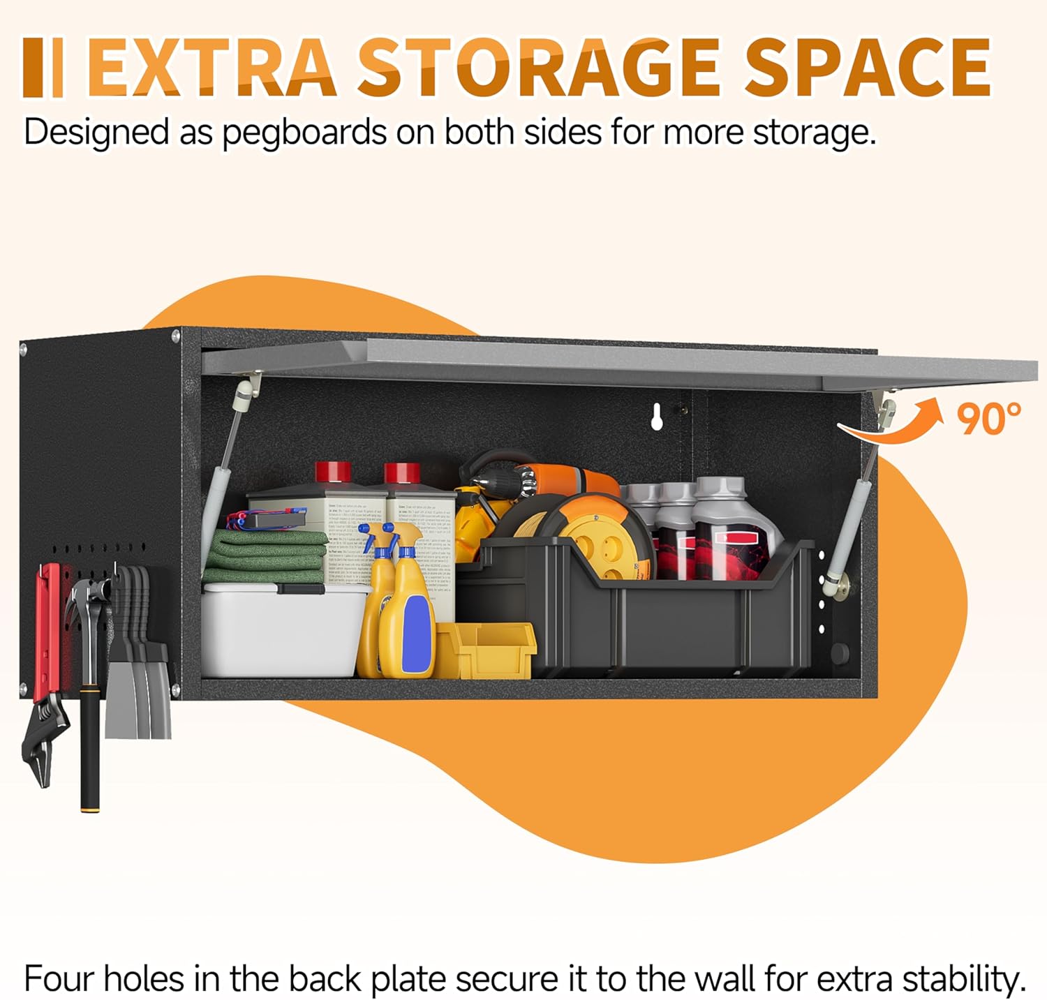 Metal Garage Wall Cabinet with Up-Flip Door,Wall-Mounted Steel Storage Cabinet, Float Tool Cabinet with Pegboard,Upper Cabinet for Kitchen,Garage,Workshop,Warehouse(13.8" H,Black&Gray)