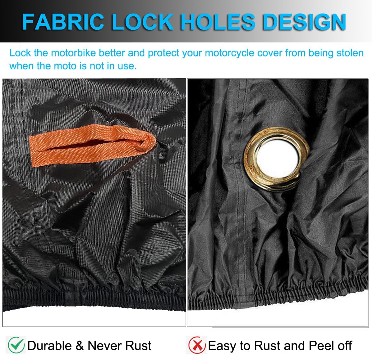 - ăAnti-theft Lock Holesă Designed with 2 lock holes (front and rearïŒis helpful to lock the motorbike better and protect your scooter cover from being stolen. Compared with the metal lock hole, ours is never rust and peeling, perfect for motorcycle outdoor storage.
