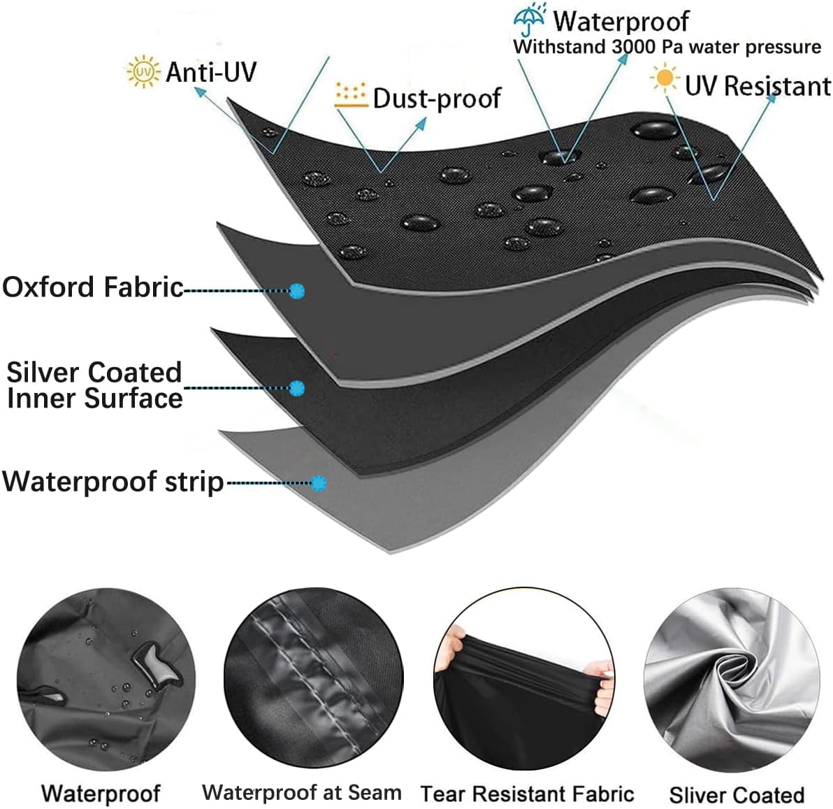 - ăDouble-stitched and Waterproof Stripă The seams are all designed with double-stitched reinforced stitching for tear resistance and durability. Besides, the bottom of the seams are designed with waterproof strips to ensure the cover better waterproof, no water seepage.