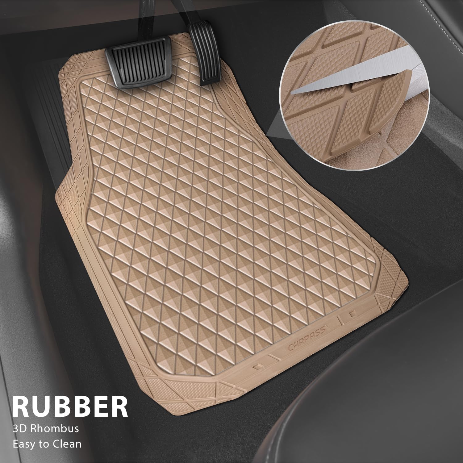 CAR PASS Beige Rubber Car Mats, All-Weather Floor Mats Full Set Durable Anti-Slip 3D Rhombus Waterproof Automotive Pad Trim to Fit Liner Universal Fit for Sedan SUV Truck Van, 4 Pcs All Beige Rubber