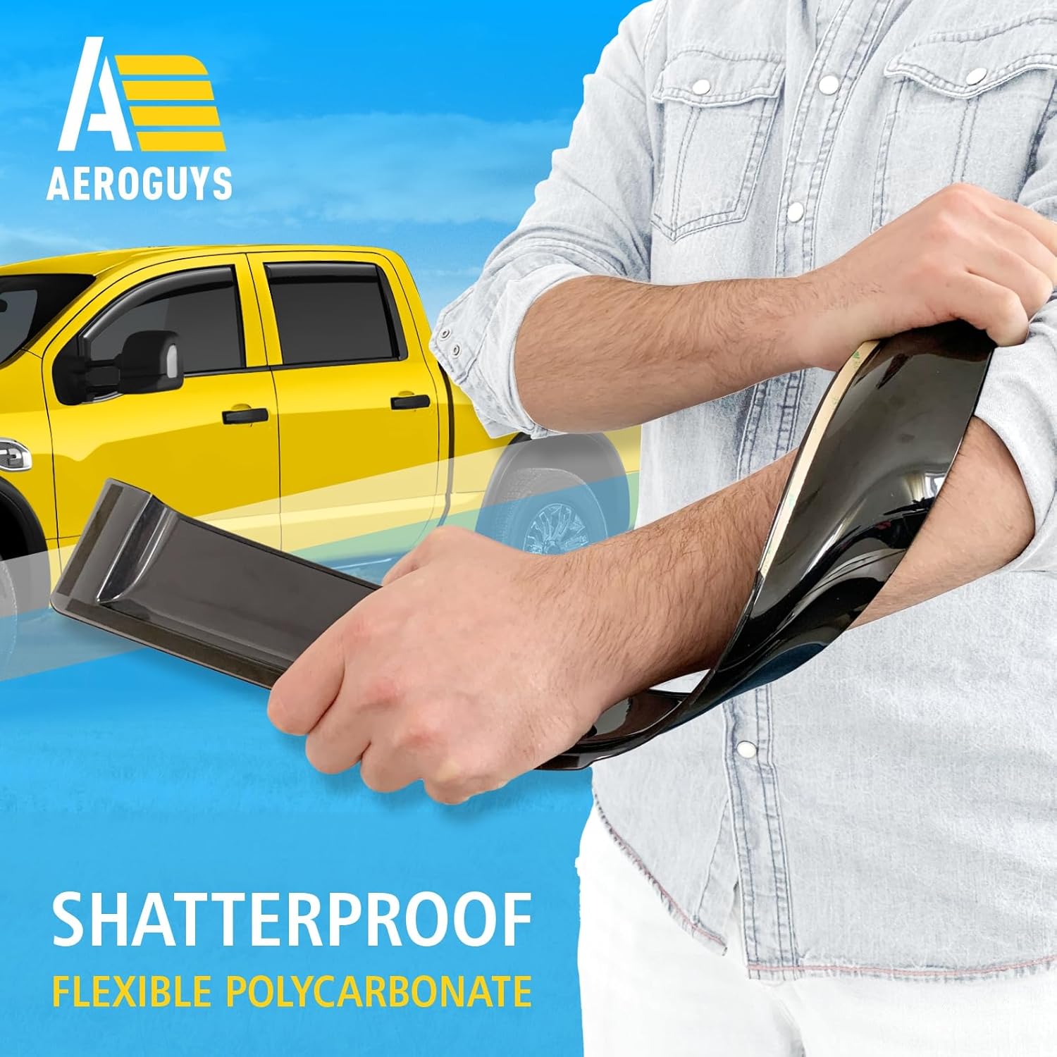 - Incredibly Durable AEROGUYS Auto Window Deflectors – They are made with strong and tough polycarbonate which is clear and scratch-resistant. They also provide UV protection making your ride more comfortable under all weather conditions.