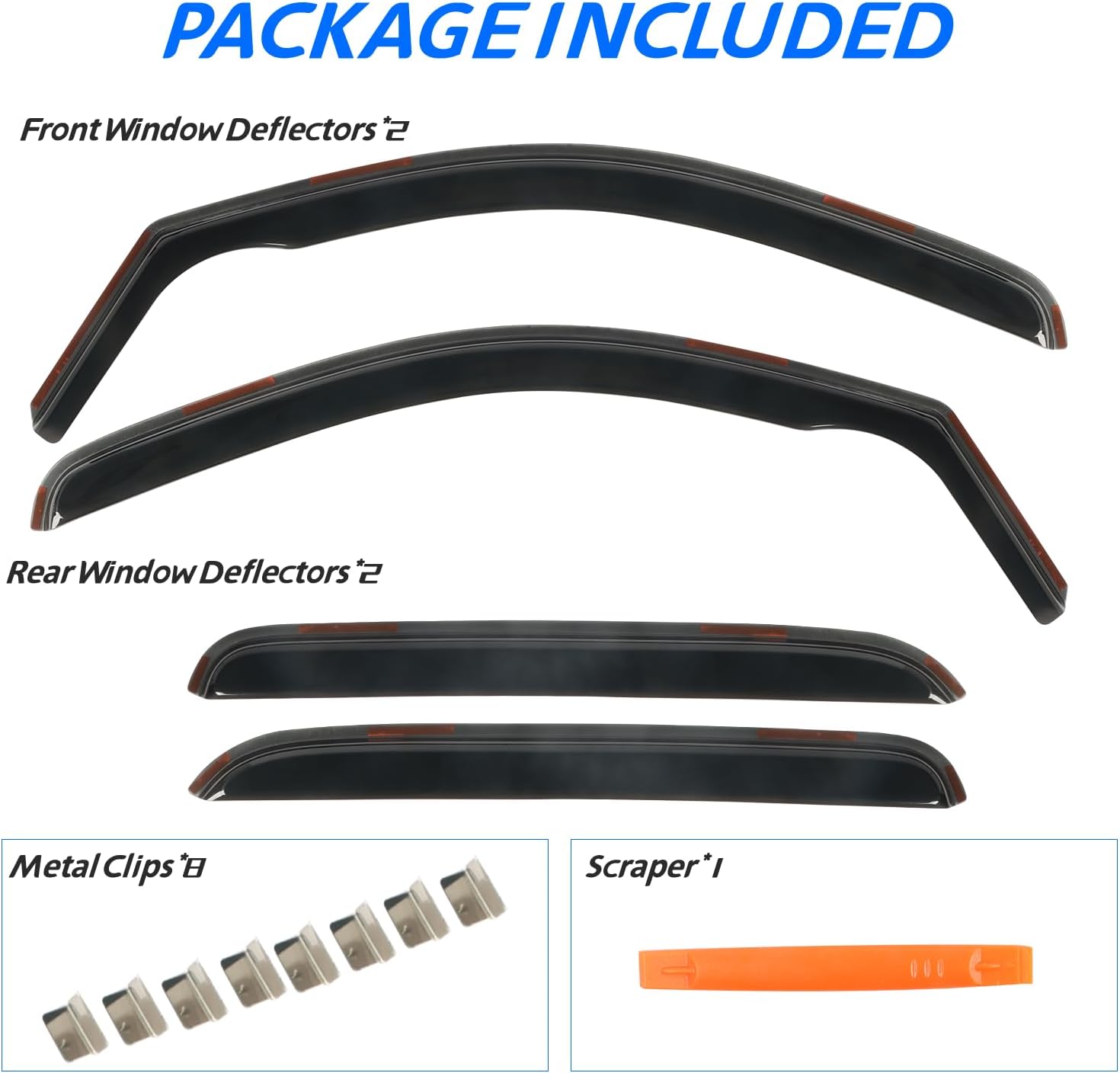 - ăIn Channel Designă CHYKORLA Window vent visors install in the window channel, provides perfect fit and sleek look for your car. Come with 4 pcs FULL-SIZE side window deflectors, 8 pcs clips, 1 pcs plastic Crowbar for a durable and secure installation. No complicated instructions are needed. Attention: Please apply the clip to fix the rain guards