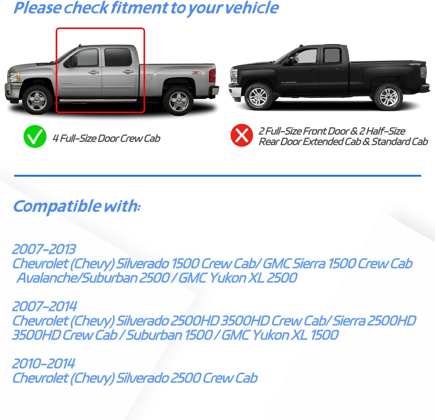 - ăVehicles FitmentsăCUSTOM ONLY fit for 2007-2013 Chevrolet Silverado 1500 Crew Cab, 2010-2014 Silverado 2500 Crew Cab, 2007-2014 Silverado 2500HD 3500HD Crew Cab, 2007-2013 Avalanche, 2007-2014 Suburban 1500, 2007-2013 Suburban 2500, 2007-2013 GMC Sierra 1500 Crew Cab, 2007-2014 2500HD 3500HD Sierra Crew Cab, 2007-2014 GMC Yukon XL 1500, 2007-2013 GMC Yukon XL 2500 (4 FULL-SIZE Doors)