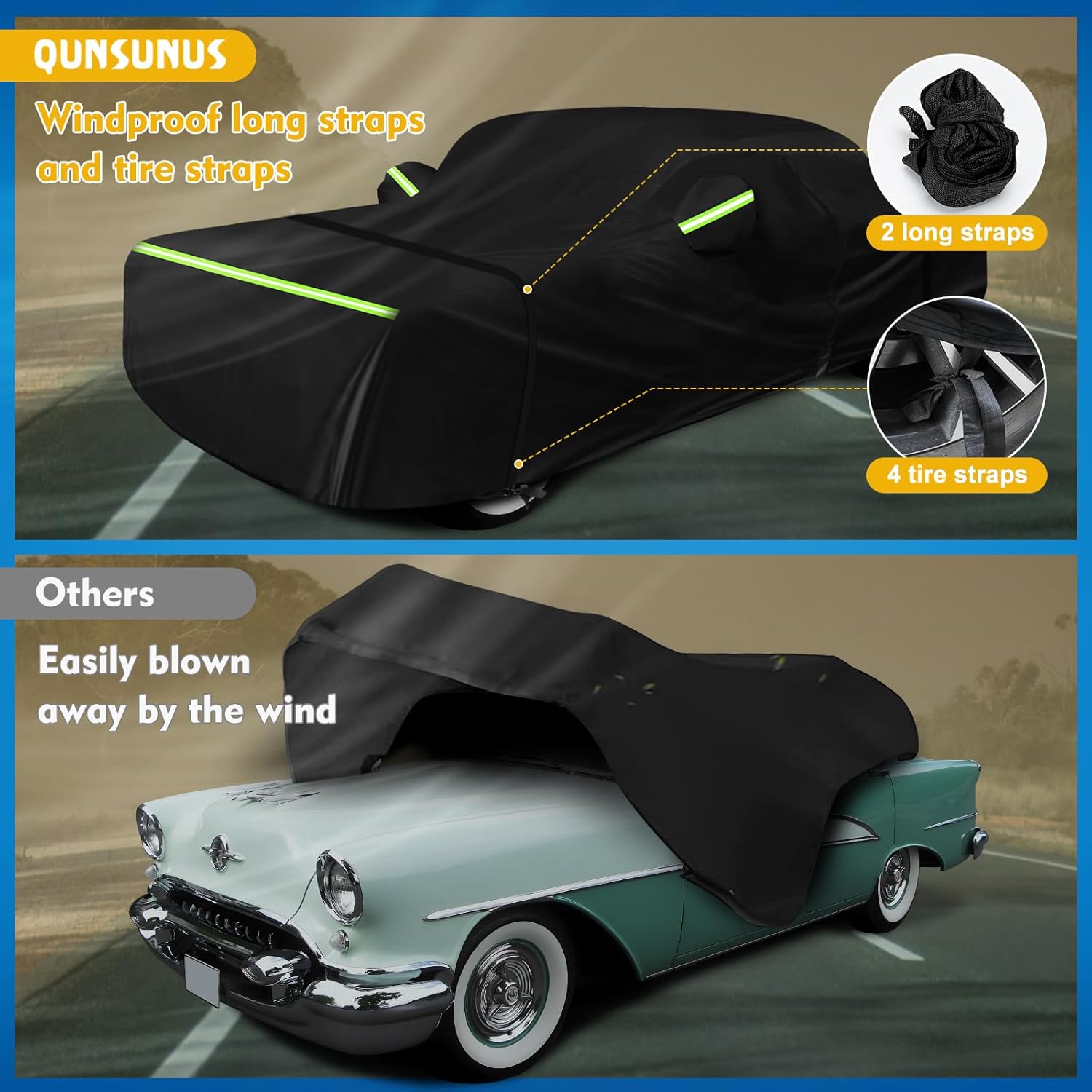 - ăWindproof Upgradeă1.There are four tire straps to keep the car covers secured in place.2. Buckle the windproof buckle that goes through the bottom of the car.3. Elastic hems on the front and back end for a better fit on your car.4. Two complimentary extra-long windproof straps can be strapped to your car's hood and rear.