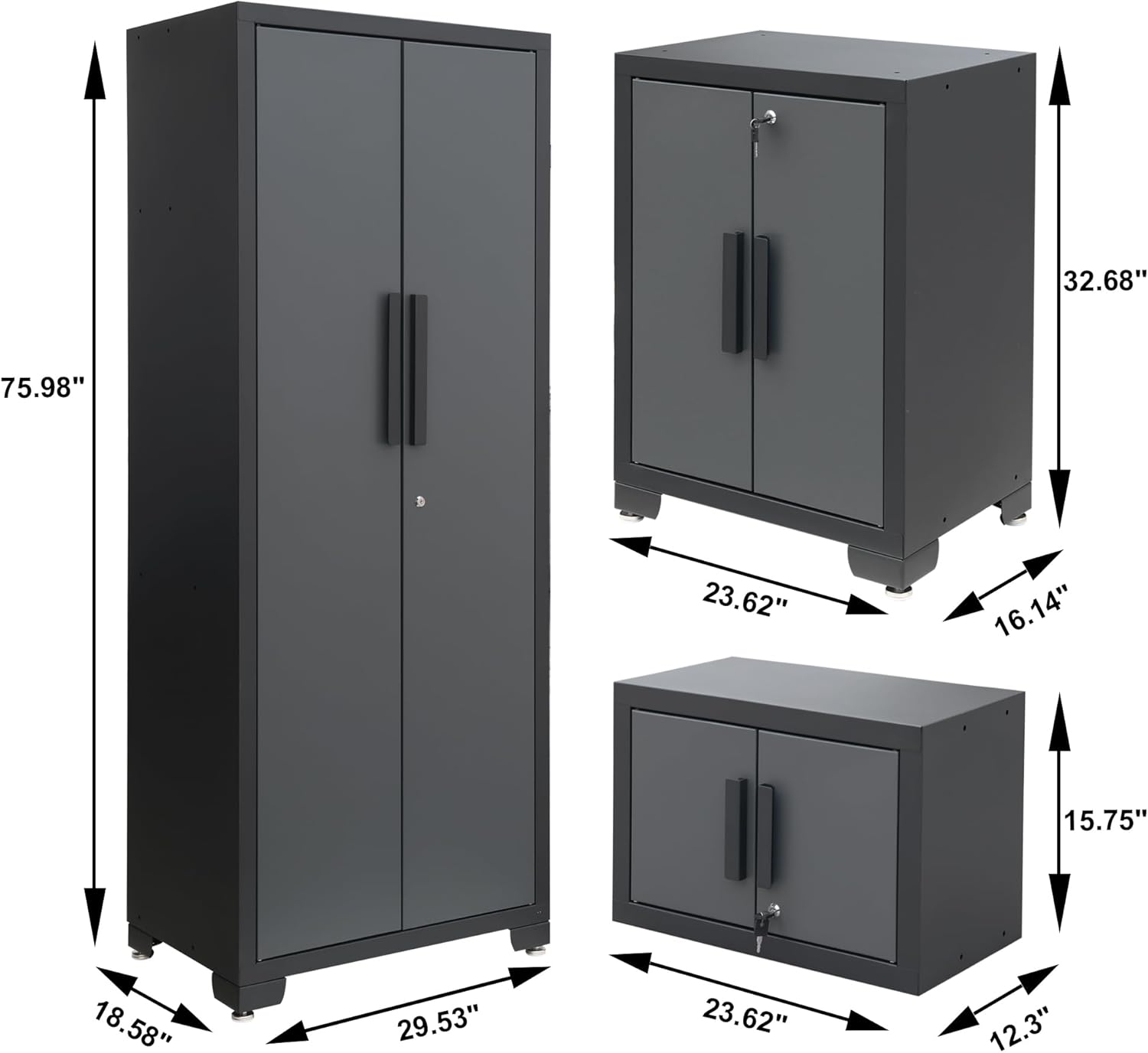 - 12 piece set includes: 2x Cabinet with drawer, 2x Cabinet with 4 drawers, 2x Tall Cabinet, 2x Wood Working Top and 4x Small Top Wall Cabinets which feature a fully welded steel structure for added support - the design is ergonomical, sufficient and organized