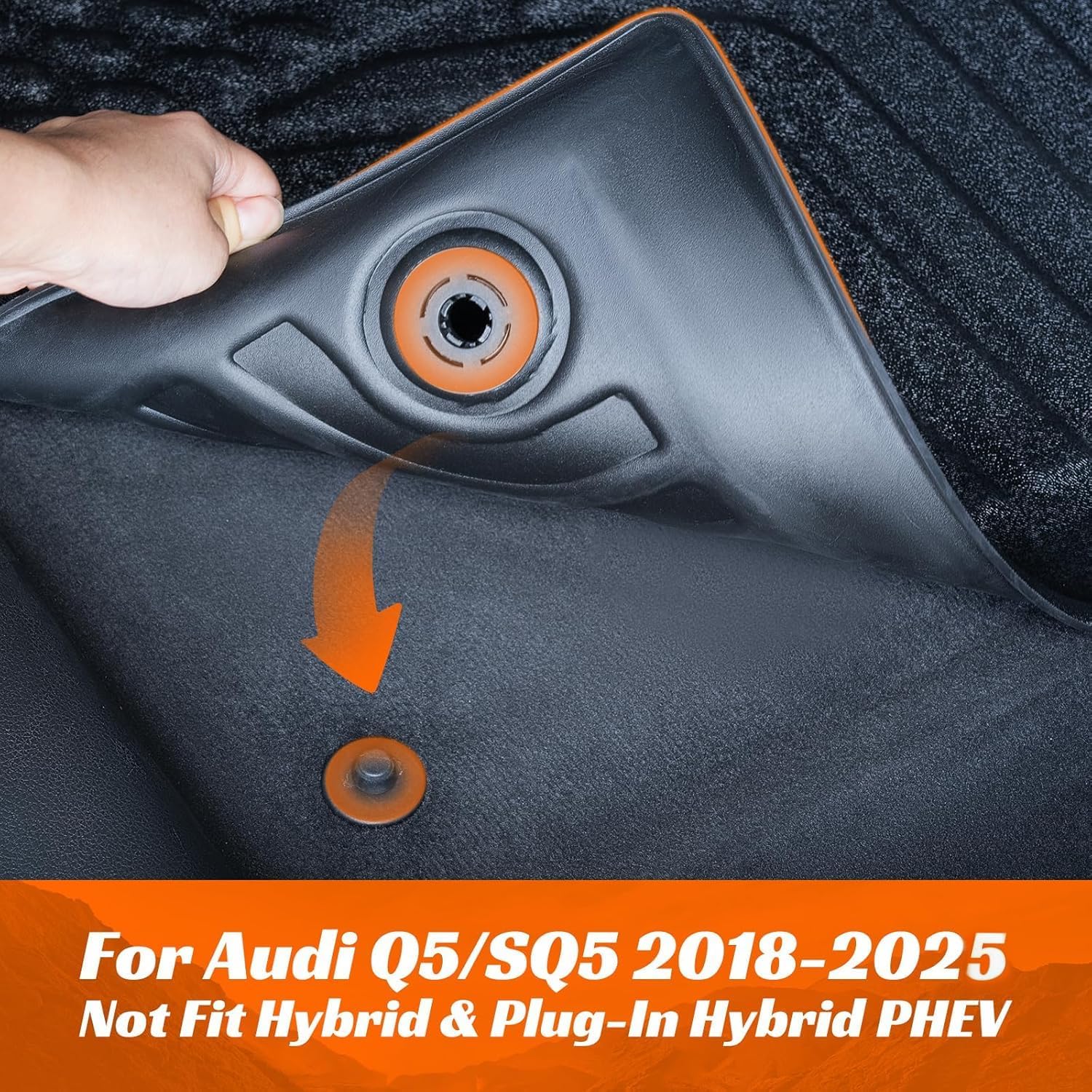 - ăCustom FităDesigned to fit for Audi Q5/SQ5 from 2018, 2019, 2020, 2021, 2022, 2023, 2024, and 2025. This 4-piece set includes driver side mat, passenger mat, rear seat mat, and cargo mat. These all weather car floor mats and rubber-like floor mats are custom fit for your vehicle with no trimming needed.