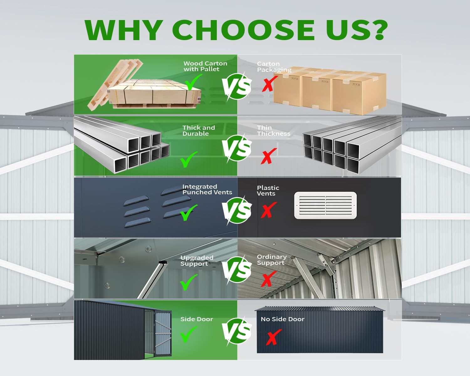 - ๐ก Easy to Assemble and Secure: Our metal car shed arrives expertly packed in a wooden carton with a pallet, complete with all necessary hardware and clear instructions. Each part is pre-cut, pre-drilled, and numbered for hassle-free assembly. Simply follow the instructions to set it up quickly. For stability, install on a leveled surface and securely bolt the expansion screws into the ground to prevent wind damage.