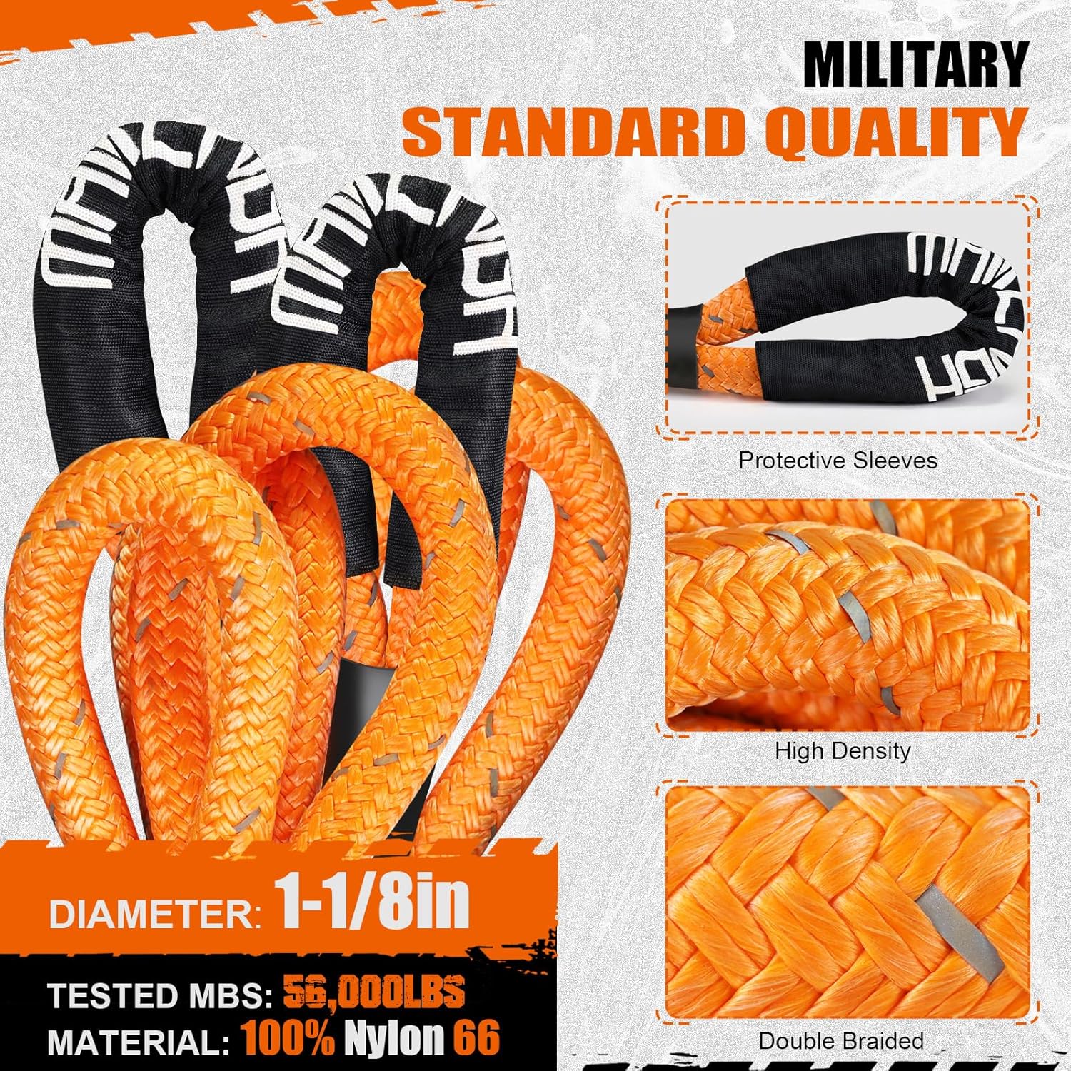 - [High Break Strength] - Upgraded 1-1/8 inch, MAIKEHIGH thicker kinetic rope is stronger and more powerful. Breaking strength up to 56,000 LBS, 2-3 times stronger than tow strap, higher strength ensures safety during recovery. It is efficiently rescues all types of vehicles, including ATVs, UTVs, SUVs, offroads, trucks, pickups, small vehicles and more!