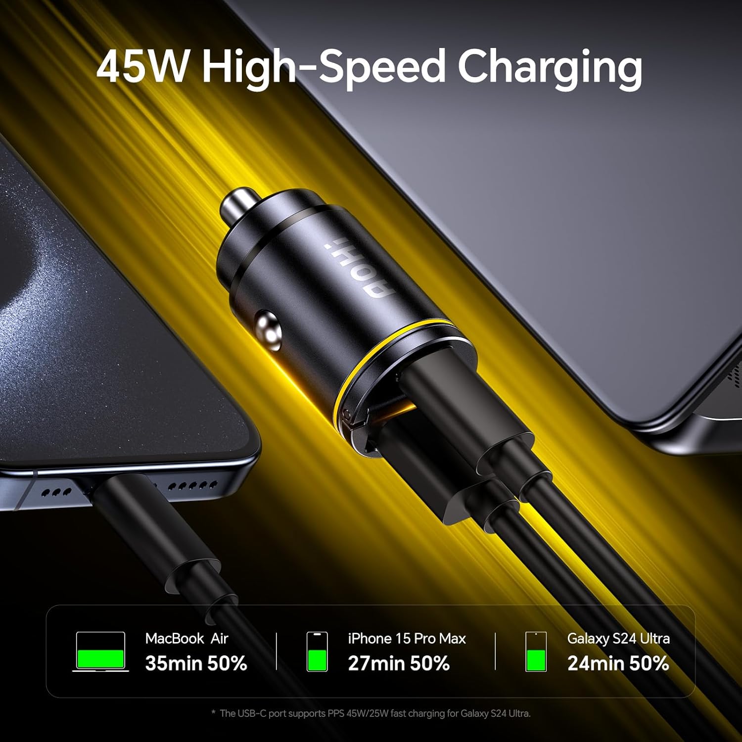 - PD 45W & QC 30W Super Fast Charging. This AOHI USB-C car charger supports PD 45W (USB-C port) and QC 30W (USB-A port) fast charging, allowing Galaxy S24 Ultra and iPhone 15 Pro Max to charge from 0 to 87% in just 35 minutes—6 times faster than standard car chargers. It also fast charges nearly all smartphones, iPads, and tablets, including MacBook Air, iPad Pro/Air, Galaxy S24 Ultra, iPhone 16 Pro Max, iPhone 15 Pro Max, Google Pixel and so on