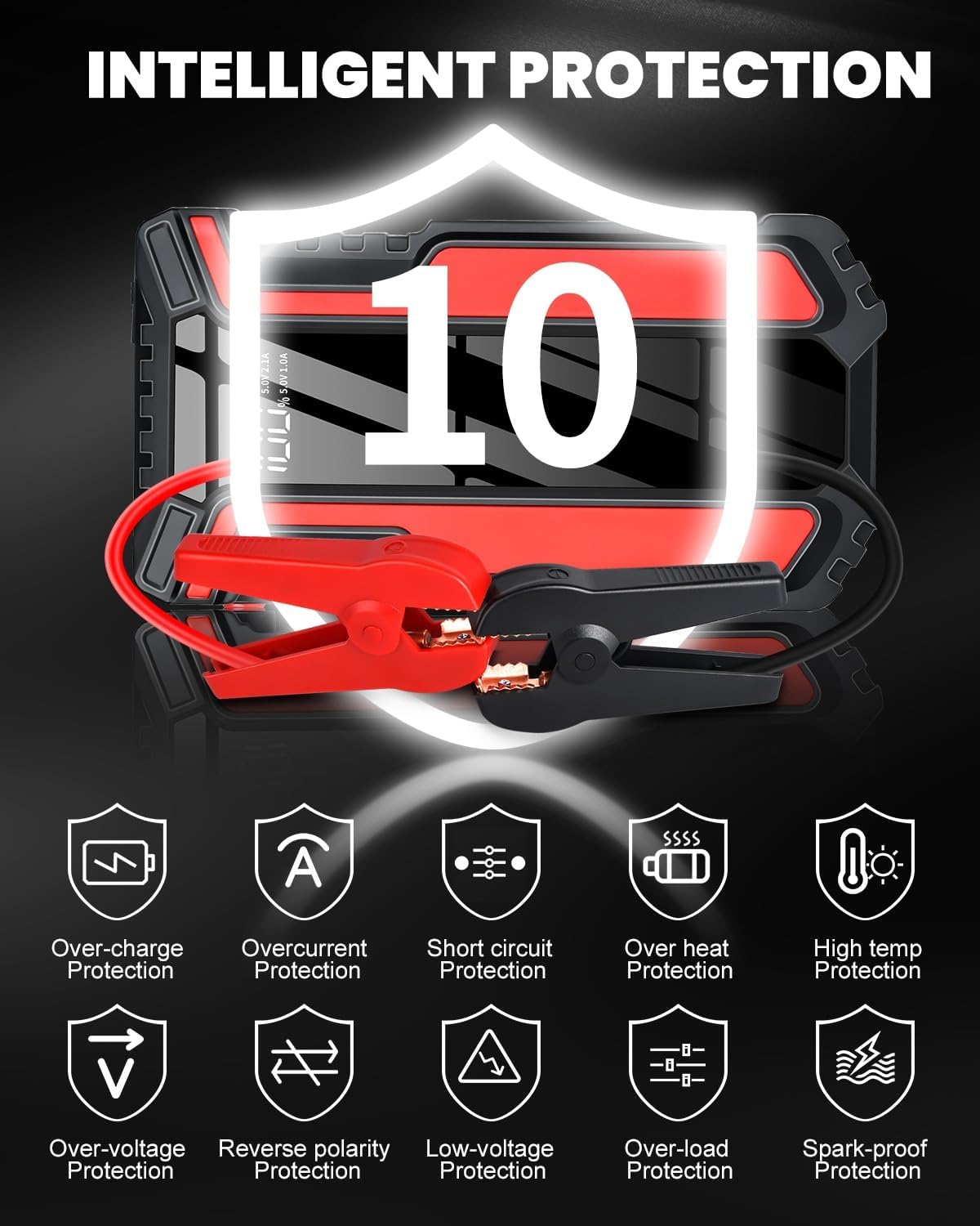 - â€ăCOMPREHENSIVE SAFETYăThe portable jump starter for car offer 10 layers of smart protection, including over-charge, overcurrent, short circuit, over heat, high-temperature, over-voltage, reverse polarity, low-voltage, over-load and spark-proof protection. Protecting you and your vehicle, make it more safe and easier for everyone to use.
