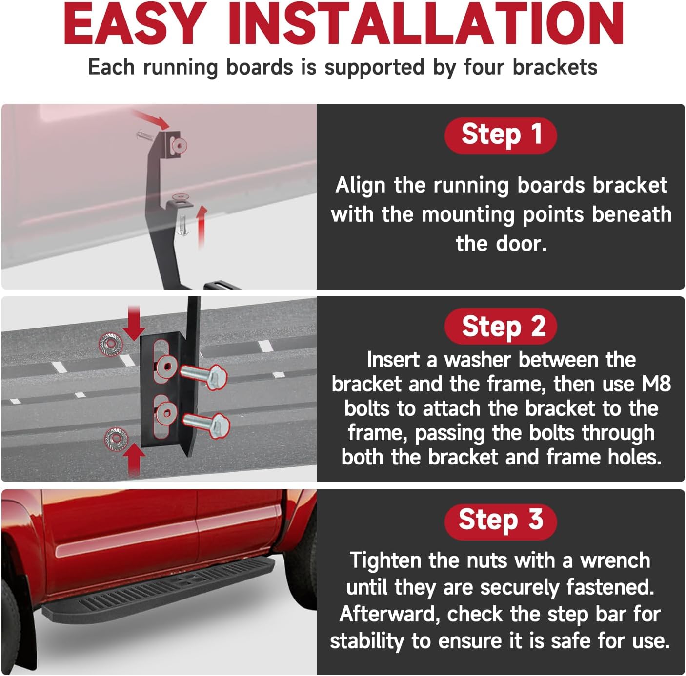 - 【Complete Kit】The set includes running boards x 2, brackets x 8, washers x 32, M8 nuts x 32, M8 bolts x 32 and wrench x 1. No additional parts are needed, and the no-drill design ensures a convenient installation process. The installation can be completed in approximately 90 minutes.