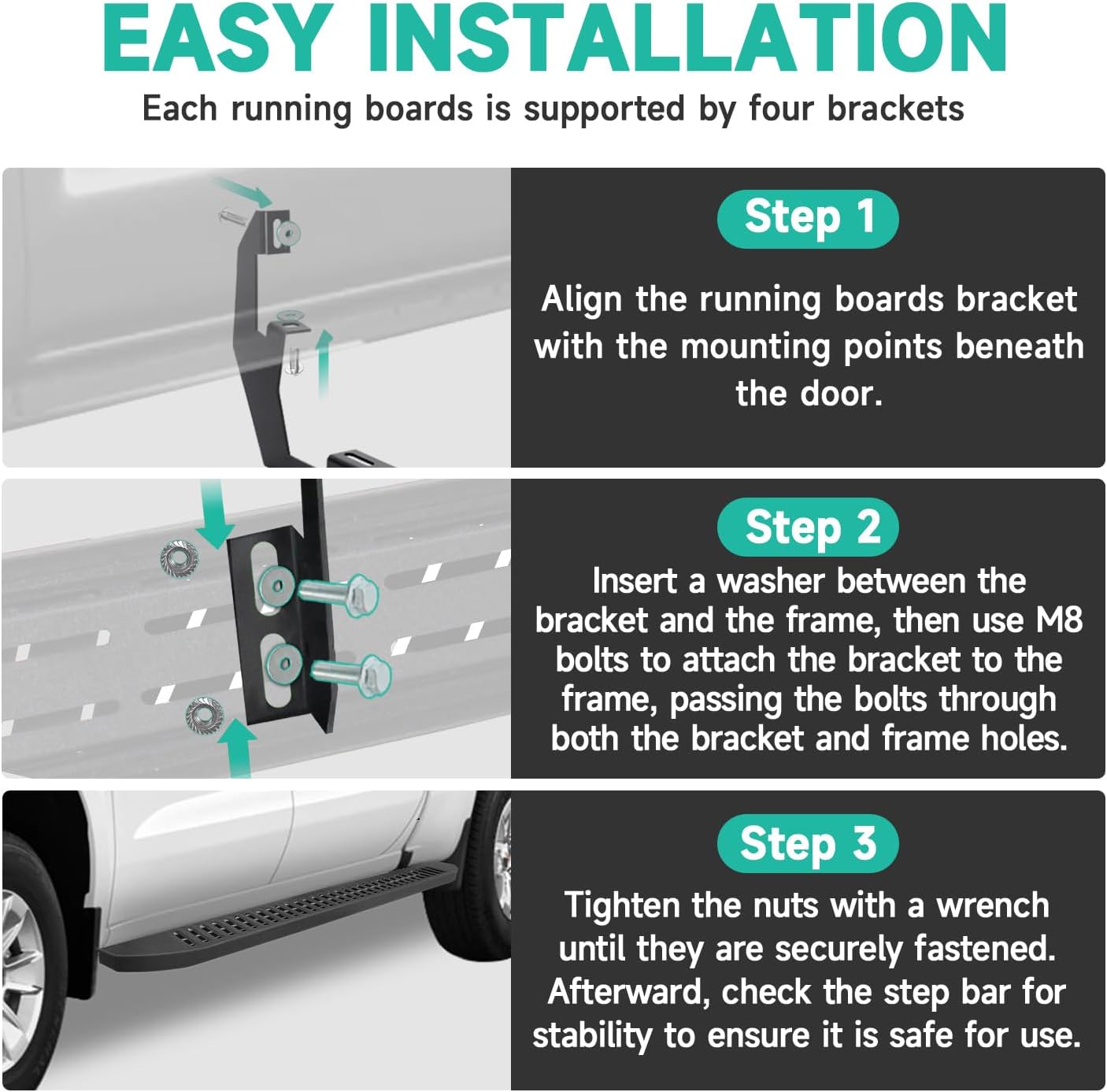 - 【Complete Kit】The set includes running boards x 2, brackets x 8, washers x 32, M8 nuts x 32, M8 bolts x 32 and wrench x 1. No additional parts are needed, and the no-drill design ensures a convenient installation process. The installation can be completed in approximately 90 minutes.