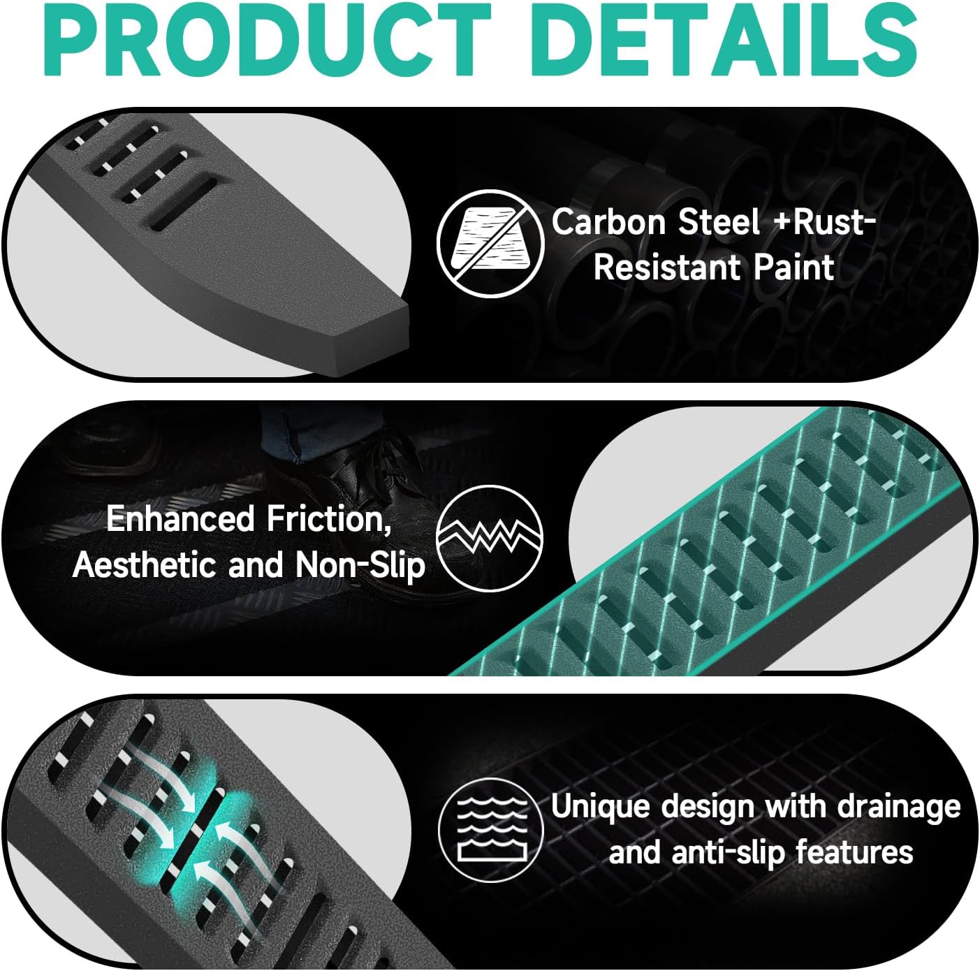 - 【Premium Material】Made from high-quality heavy-duty carbon steel with a black powder-coated finish, these running boards are waterproof, corrosion-resistant, and rust-proof, ensuring extended durability and a longer lifespan.