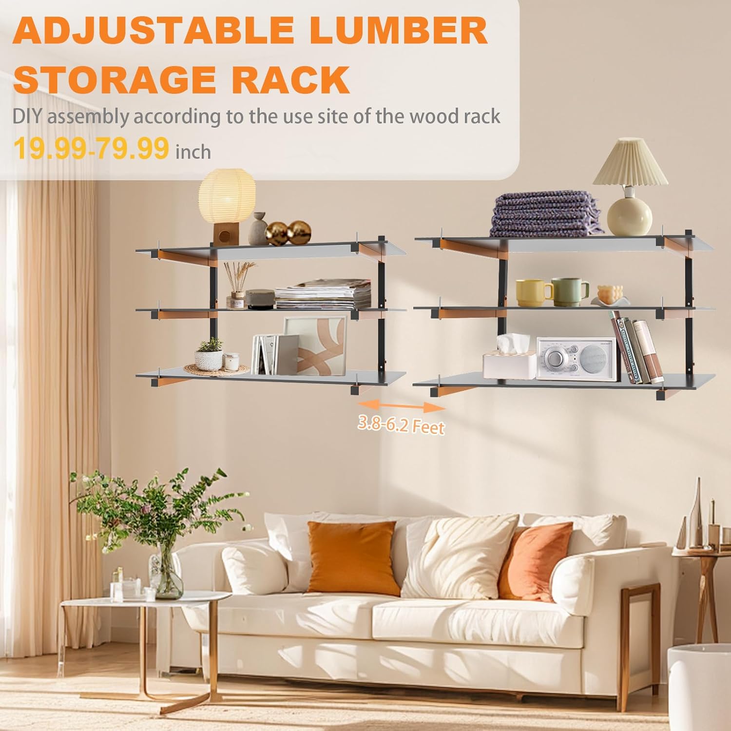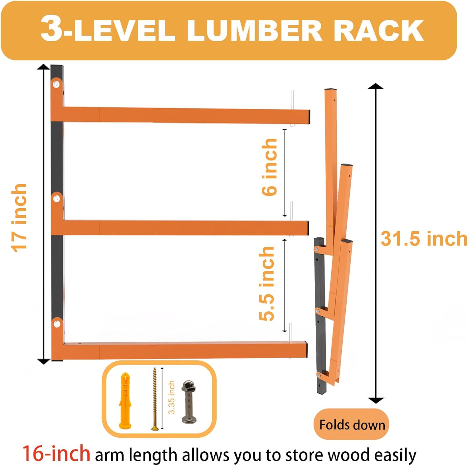 Lumber Rack Wall Mount, Heavy Duty Wood Storage Racks, 3-Level System Garage Shelving, 380 Lbs Capacity Organizer Shelves, Folding Orange Brackets, 2 Pack Hanging Metal Shelf for Indoor and Outdoor