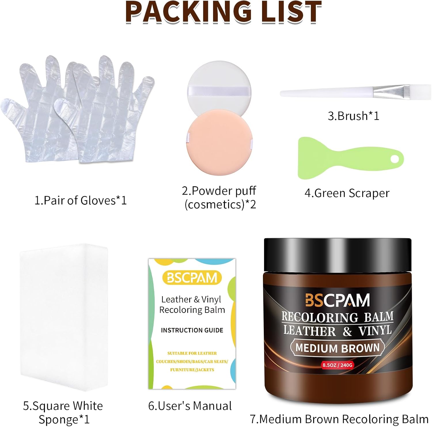 - Easy DIY Repairs: Leather repair kit includes, 1 Recoloring Balm + 1 Sponges + 2 Gloves + 2 Powder Puff + 1 Brush + 1 Putty Knife + User's Manual,meet any leather repair project
