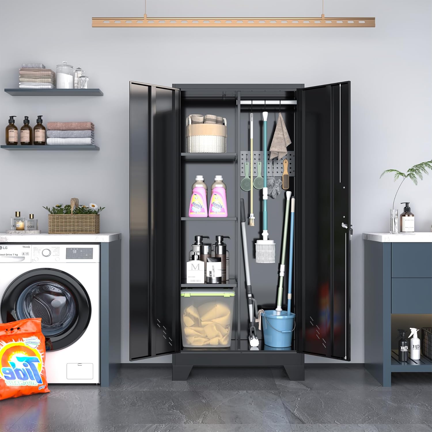 Metal Storage Cabinet,61" Tall Storage Cabinet,Utility Cabinet for Brooms and Mops,Laundry Room Cabinets,Tool Lockable Organization,Black