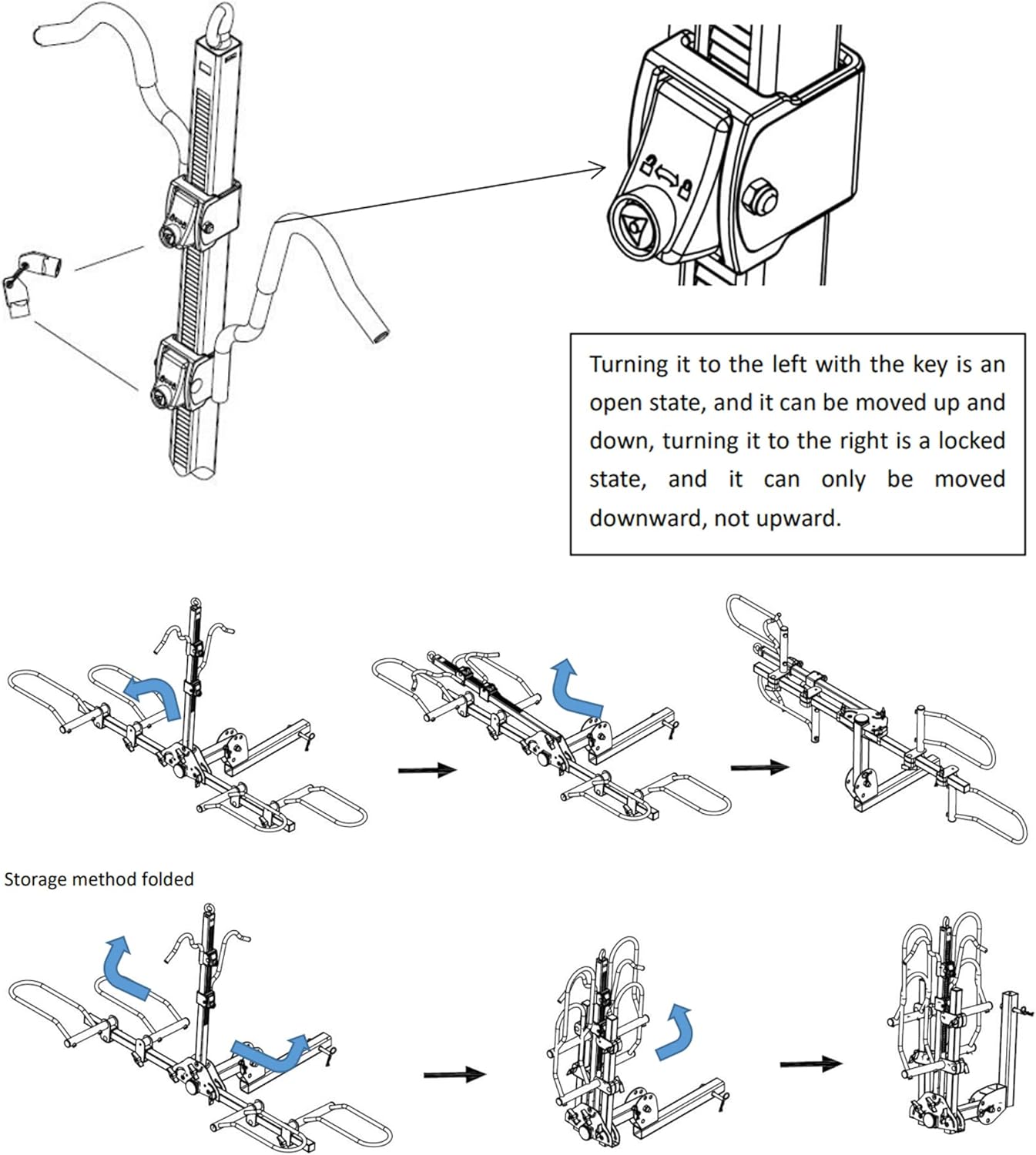 - Effortless Installation & Removal: Designed for easy setup, this Hitch-Mounted Bike Rack quickly attaches to your 2-inch vehicle’s hitch, making it simple to load and unload your bikes in just minutes. No tools are required for installation—just secure the rack and hit the road! (J-hooks with lock Use Instruction - Turning it to the left with the key is an open state, and it can be moved up and down; turning it to the right is a locked state, and it can only be moved downward, not upward.)